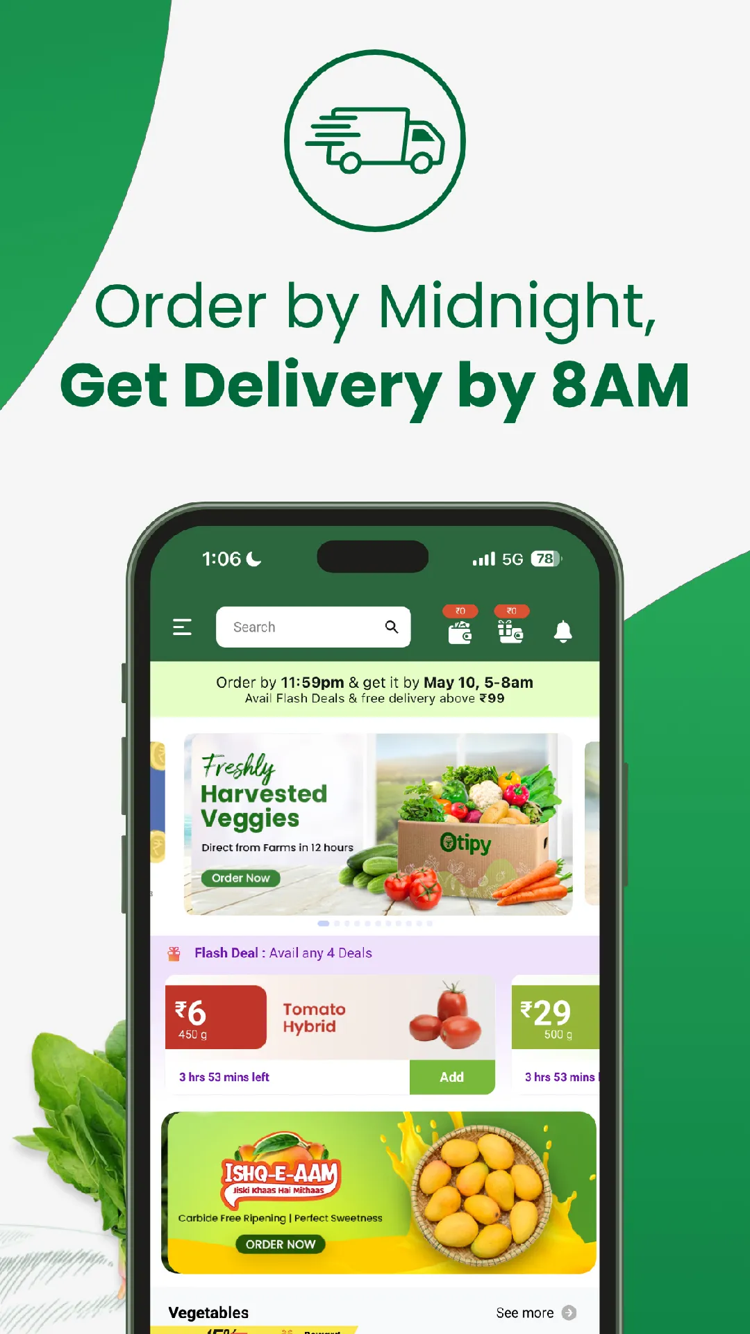 Farm-Fresh fruits and vegetables online. Order by midnight and next day delivery by 8 am.⏰ India’s first and finest fresh produce app that delivers fresh veggies and fruits straight from the farms in 12 hours. We deliver FRESH, SAFE & HYGIENIC produce to more than 10 lac customers across Delhi-NCR, Mumbai, Gurgaon, Noida, Greater Noida, Faridabad, Ghaziabad, Meerut, Bhiwadi, Sonipat & Thane. We offer the largest selection of fresh and seasonal vegetables straight from farms and highest quality ready to fruits sourced from origin. You can also order groceries online from 1100+ items and your favorite brands in categories like : Dairy, Bakery, Atta, Snacks, puja essentials etc. Enjoy hassle free online shopping and delivery experience. ...