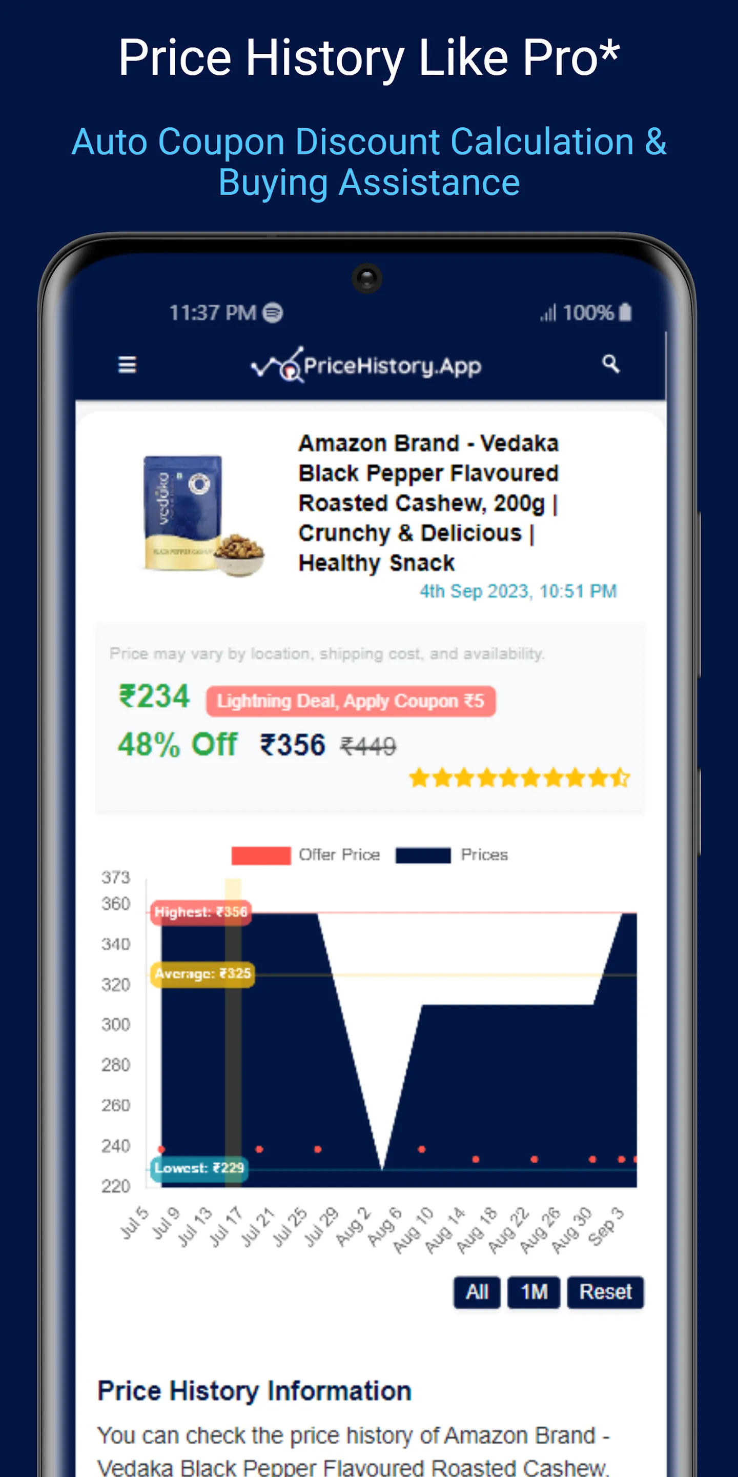 Price History - Best Price Tracking App for Online Shopping Discover Price History, your essential tool for tracking price changes and finding the best deals on Amazon and Flipkart. Price History offers easy tracking of product prices across major e-commerce stores in India. Get price history charts, price drop alerts🔔, AI-powered price predictions, and more! With Price History, you can instantly check past prices to make smarter purchases. Our app tracks every price change and discount for you....