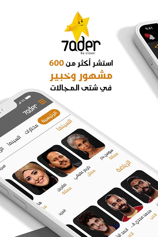 7ader App The first interactive Arabic platform that allows the fans to communicate directly with celebrities and brings you together with a carefully selected group of stars and experts on your mobile phone. The application offers you an exceptional experience in communicating with the stars and celebrities of the Arab world, you can now communicate directly with actors, singers, media professionals, athletes, doctors, chefs, advocates, nutritionists, fashion and football analysts, as well as tax experts, the banking sector, legal consultants and others in various fields. They are always ready to receive your calls on the application after reserving the call. Our team works relentlessly to ensure a safe digital environment for all users of the application and to ensure a positive and enjoyable experience is delivered....