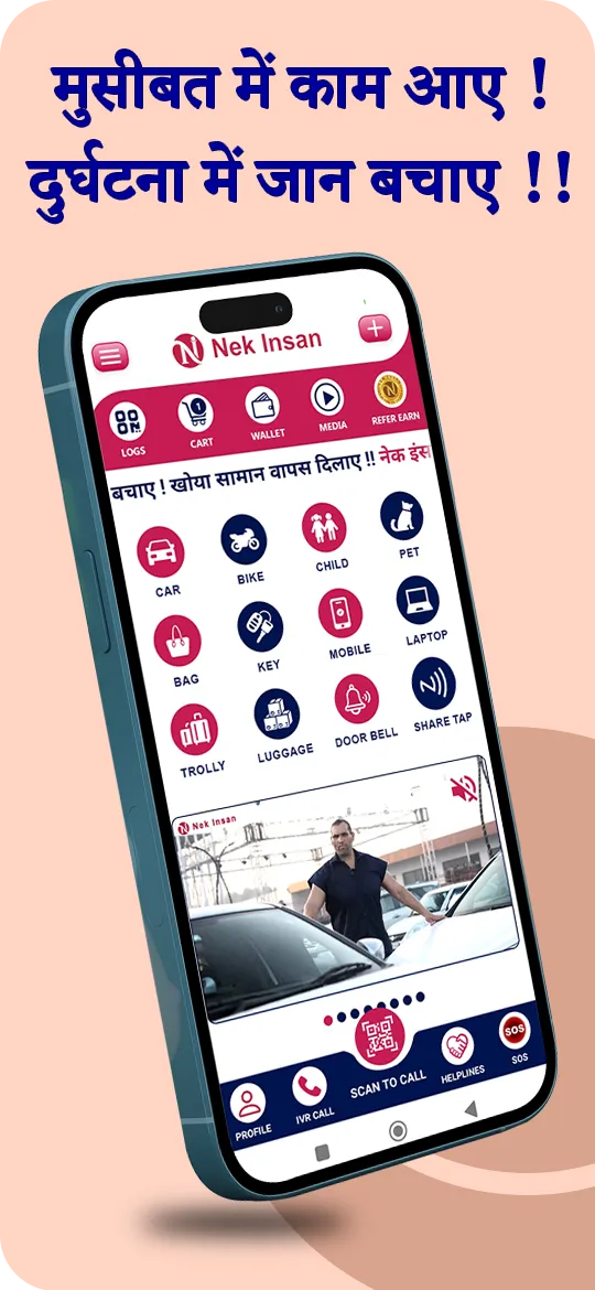 मुसीबत में काम आए ! दुर्घटना में जान बचाए ! खोया समान वापस दिलाए !! नेक इंसान ऐप, QR Sticker !! Life safety in emergency- Road accidents have been a major cause of concern across India. Every year more than 5 lakh accidents occur in India and 1.5 lakh lives are untimely lost. The first one hour immediately after the accident is called the ‘Golden Hour’ during which there is the highest likelihood that prompt medical and surgical treatment will prevent death. The honourable Supreme Court has given the title of ‘Nek Insan’ to any person who helps someone lying injured on the road.. In case of an accident, informing the family members of the victim can ensure that appropriate medical aid and other help is provided in time to save the victim’s life. ...