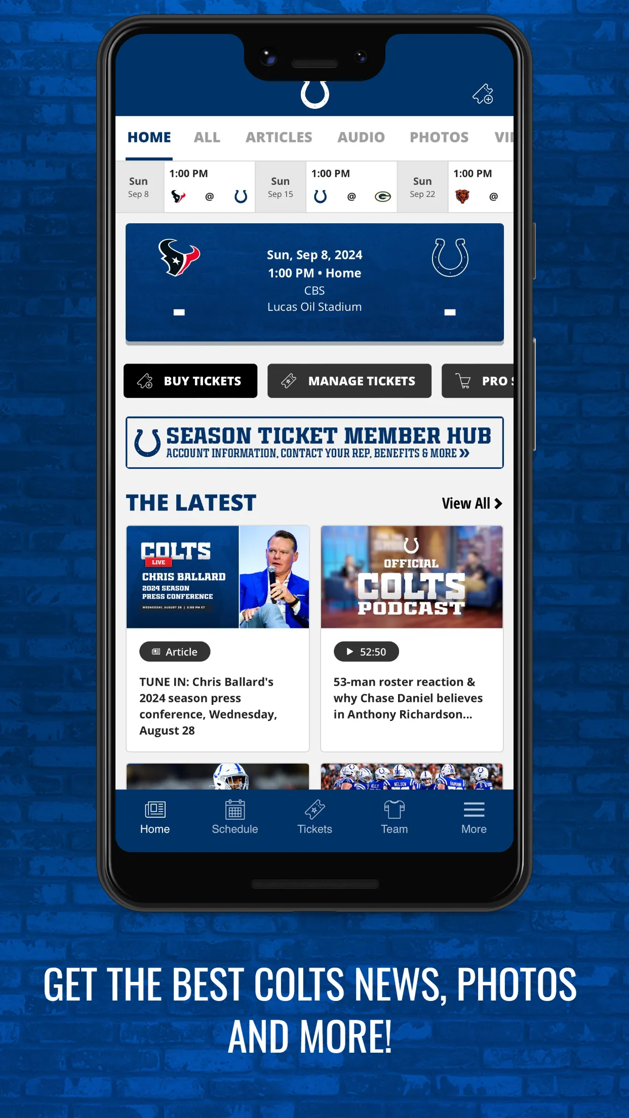 Welcome to the Official Indianapolis Colts Mobile App - A must-have for any Colts fan! Stay connected to your favorite team throughout the year with the latest news, behind-the-scenes access and in-depth event coverage. PLUS, you'll have everything you need for gameday at Lucas Oil Stadium with your digital tickets in the Colts App! ...