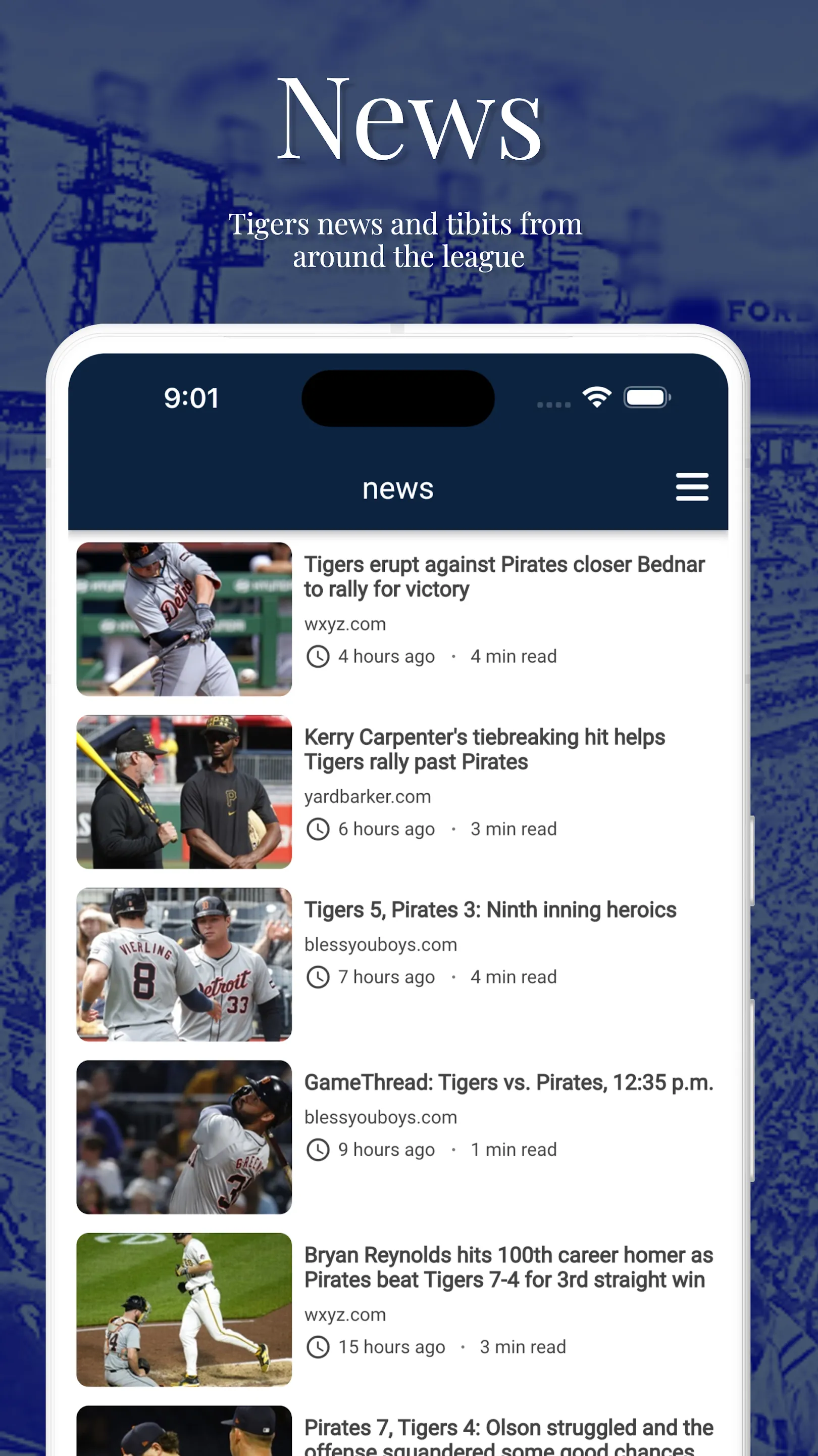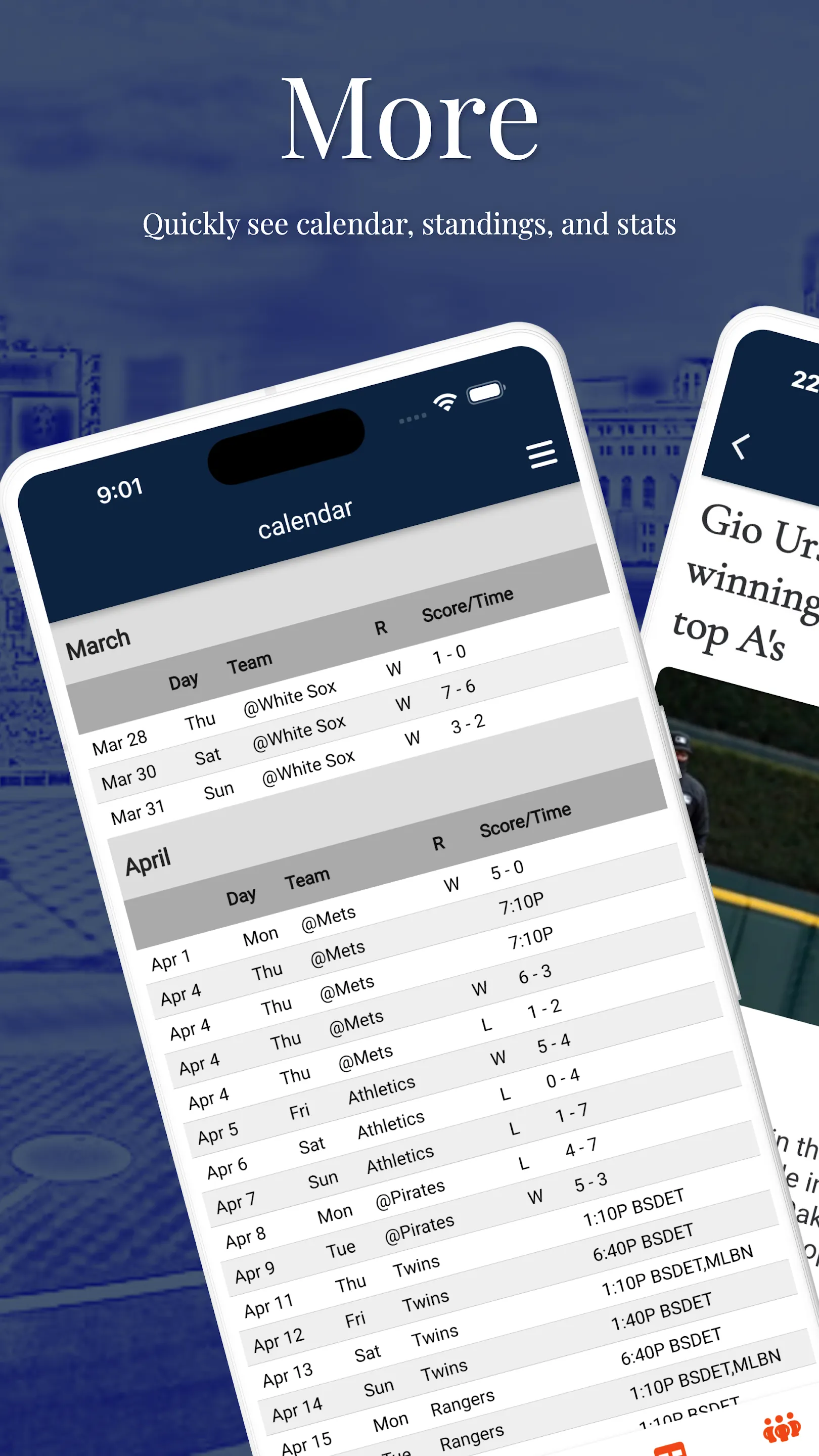 Follow Michigan's team with Detroit Baseball, an unofficial app about the Detroit Tigers. We keep it simple, with Tigers news and opinion, live scores, team schedule, player stats, and MLB standings. While we check in on what's happening around baseball and the minors, we focus on the Tigers. Detroit Baseball is always free, with no sign-in ever required, no in-app purchases, and no nag screens. Note: This application is not affiliated with Major League Baseball or the Detroit Tigers.