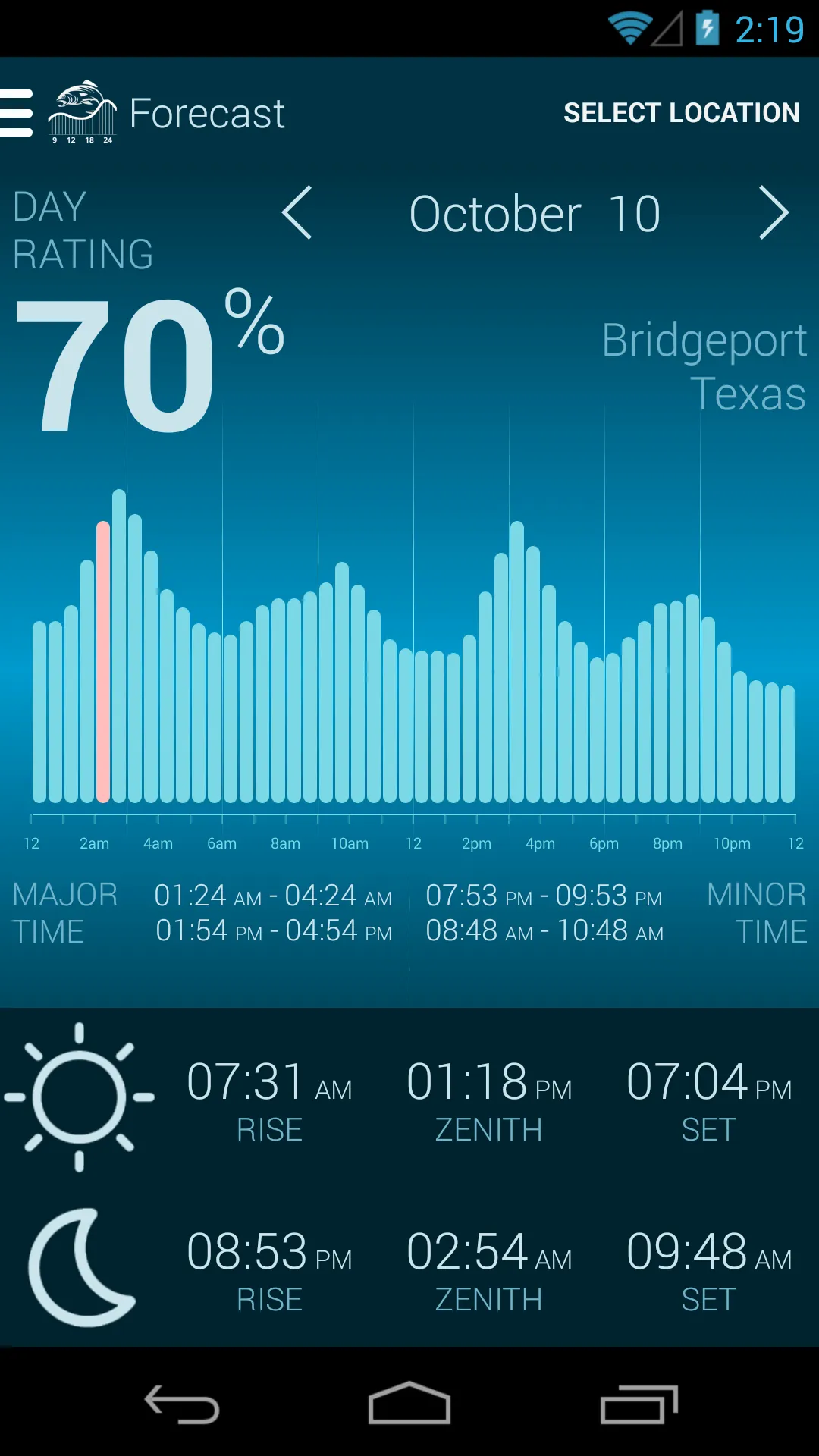 Make your fishing and hunting extremely effective with forecast from Fishing & Hunting Solunar Time! Based on the Solunar Tables theory application will help you to determine as precisely as possible the feeding of all types of fish and wildlife. Depending on the position of the moon and its phases and the position of the sun you will have the information about best time for fishing or hunting. Use Fishing & Hunting Solunar Time to plan your trips to fishing or hunting in order to maximize your chances of success! Save your favorite places using Fishing & Hunting Solunar Time for easy access to Solunar Forecasts in this places. ...