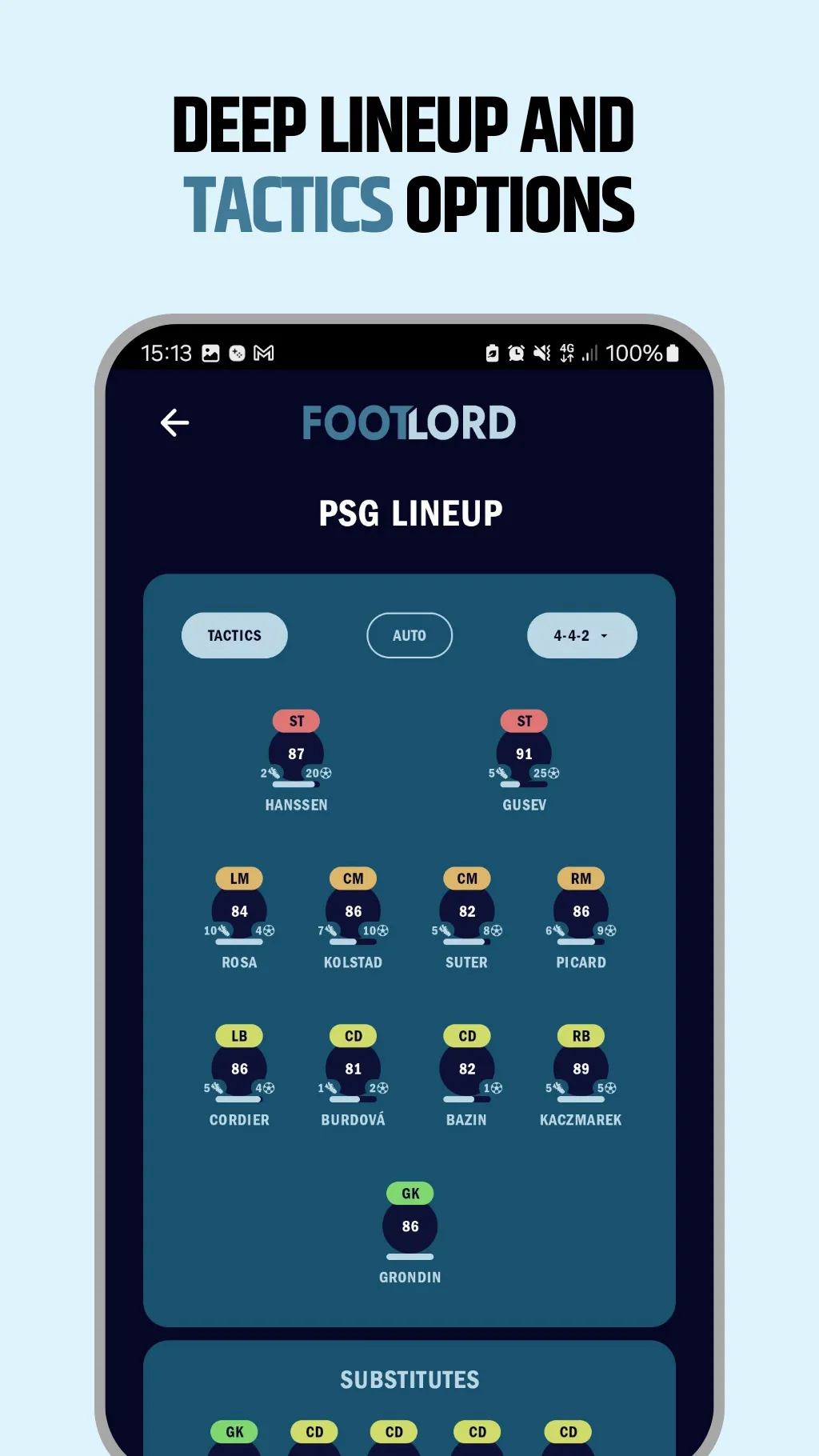 Discover the ultimate football management experience with FootLord, the mobile game that puts you in the shoes of a manager in the football world. Manage every aspect of your club, from market strategy and tactical details to financial management, earning a reputation through victories and trophies. BECOME THE DEFINITIVE MANAGER - Market management: dominate transfer and loan sessions with savvy negotiations to secure the best talent. - Youth sector: discover the best soccer promises in your academy and trust them by making them debut in the first team. - Strategies and formations: implement revolutionary tactics, manage player rotation, and find a balance to win every game and keep the reserves happy....