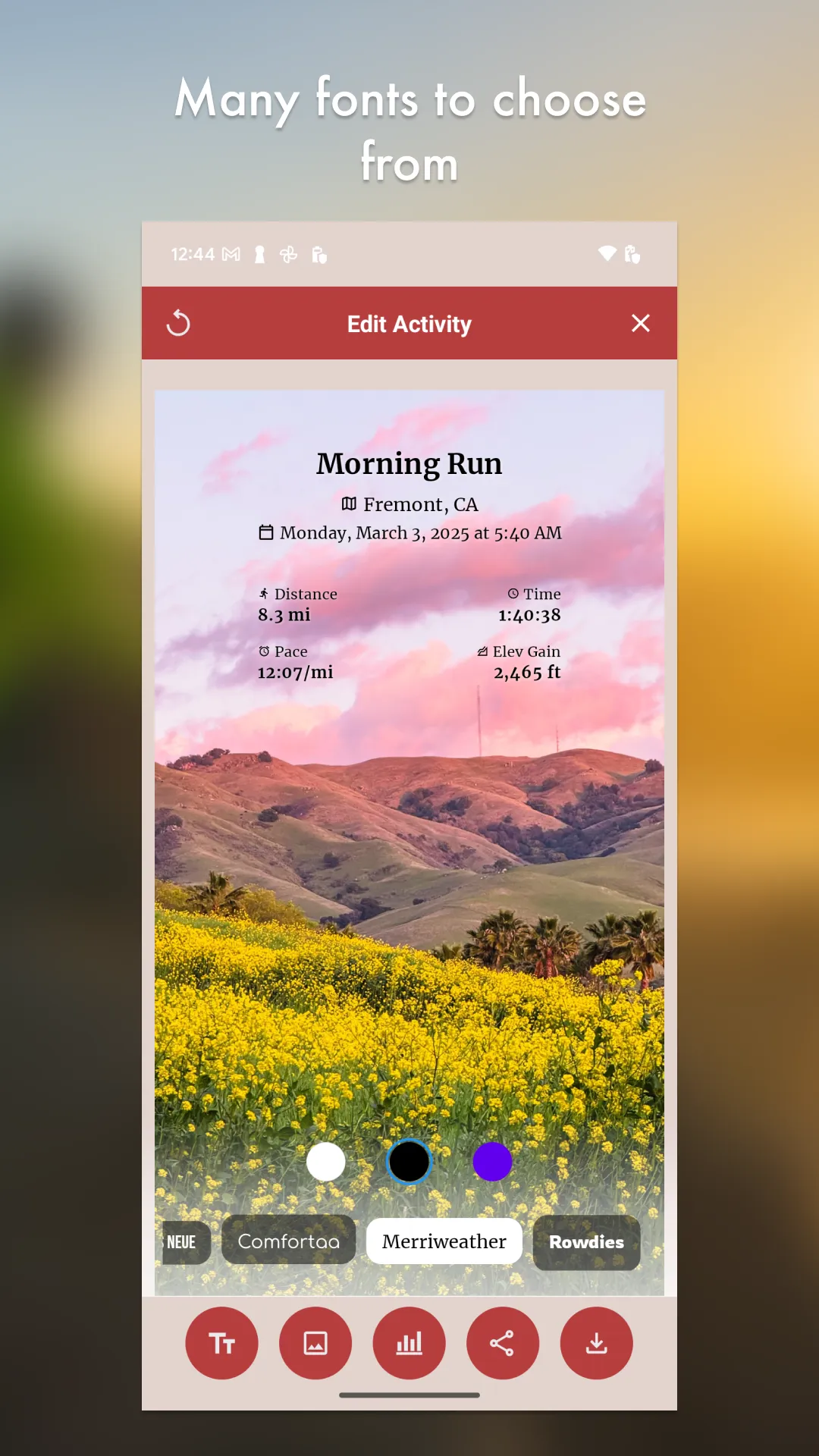 Run Story is the easiest way to share your Strava running stats! Contact me at @madewithrunstory or @mikeruns26.2 on Instagram for feedback or issues. - Connect your Strava account to retrieve your latest activity data - Hide or show whatever information you want - Change fonts and font colors - Customize layout by dragging, resizing and rotating...