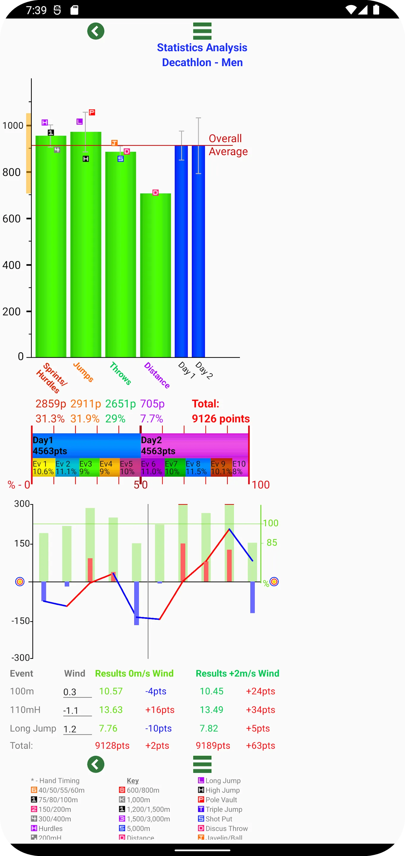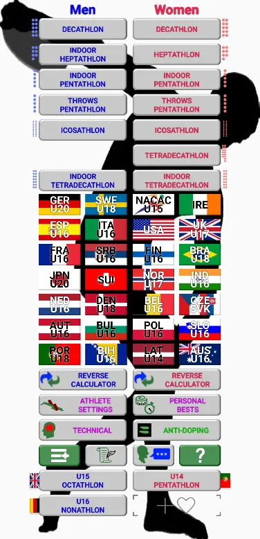 -Calculate scores for all major combined events competitions -WMA/IAUM age grading available for all senior events with option to switch between age factors (e.g. 2023/2014) Men’s and Women’s Decathlon, Indoor Heptathlon, Indoor Pentathlon x 2, Outdoor Pentathlon, Icosathlon, Indoor Tetradecathlon, Throws Pentathlon, Sprint Triathlon, Indoor Triathlon x 3, Runners Decathlon, Ultraweight Pentathlon Women’s Heptathlon, Tetradecathlon World Athletics U18 Men’s Octathlon National events for 35+ countries....