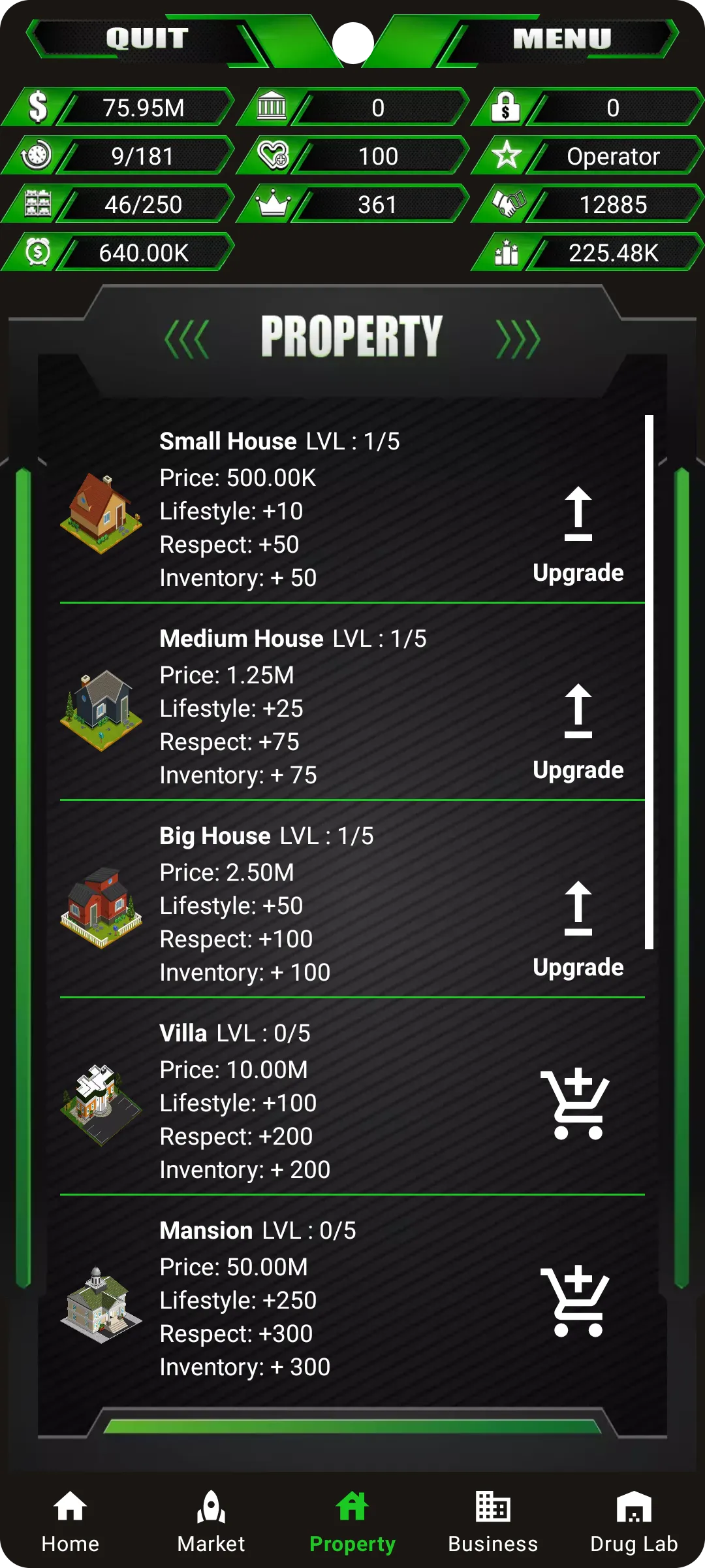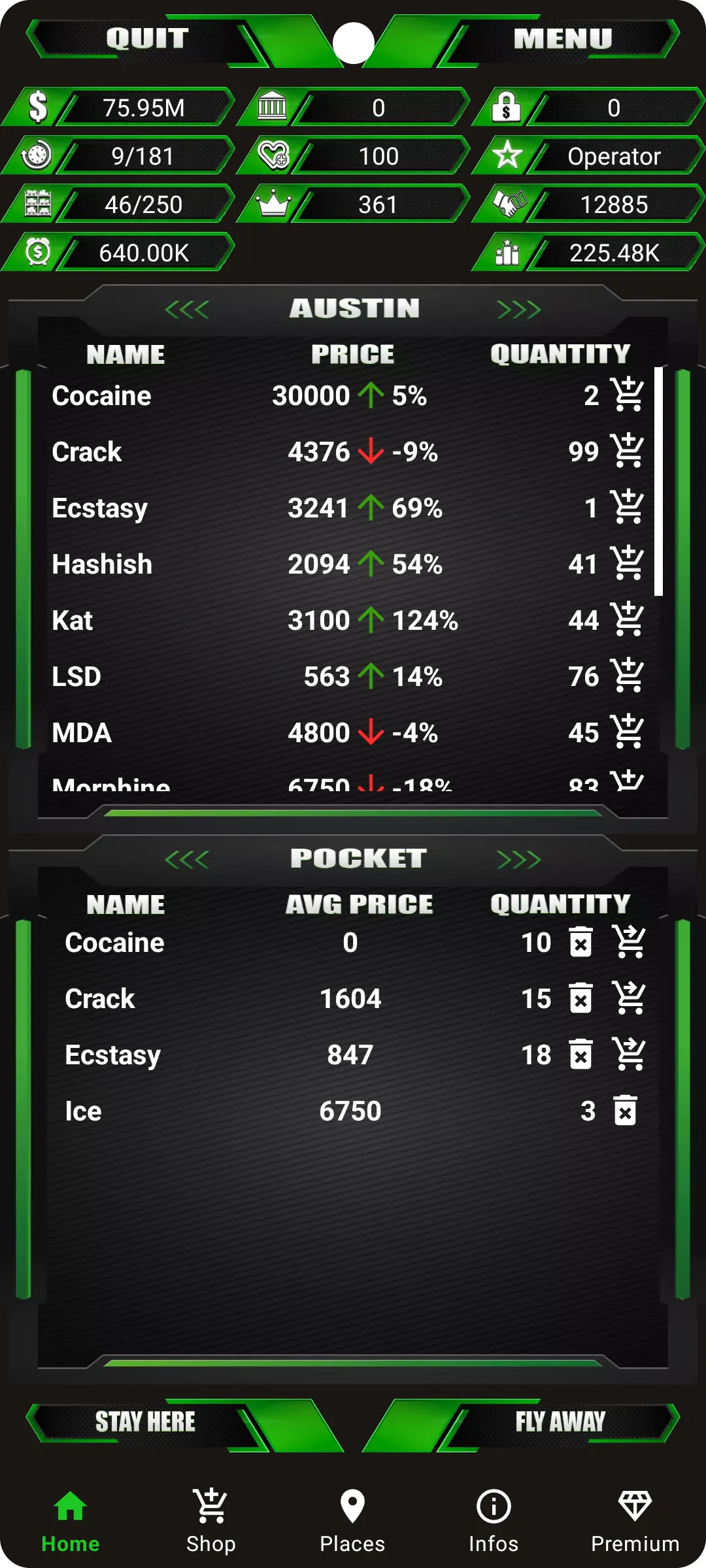 This game is remake of the original Drug Lord 2 from Windows PC, but i extended it with extra features, like business, drug lab, property and etc.. Welcome to the high-risk world of drug dealing! In this game you assume the role of a wannabe drug dealer with a couple of thousand bucks in your pocket. It is your goal to turn that small investment into as much wealth as you can in just 50 days by selling and buying drugs. You can boost days if you earn bigger rank, or buy business. Be warned though, the life of a drug dealer is a risky one; it seems everyone is out to do you harm in one way or another--the police, street gangs, loan sharks, and yes, even your own customers. Main features: - 50 Starting days, what can be extend to few houndred - 6 Ranks...