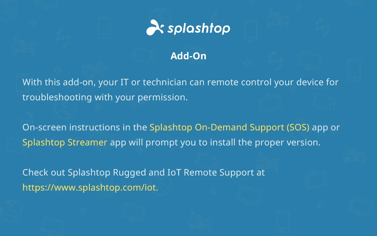 **Notice: This add-on supports Samsung device with Knox 2.7.1 and up.** This add-on enables remote control of a Samsung device through the Splashtop SOS app or Splashtop Streamer app by a technician using Splashtop Rugged & IoT Remote Support with proper commercial license required. Using this add-on with Splashtop SOS: 1. Download and launch Splashtop On-Demand Support (SOS) app on your mobile device (https://play.google.com/store/apps/details?id=com.splashtop.sos)...