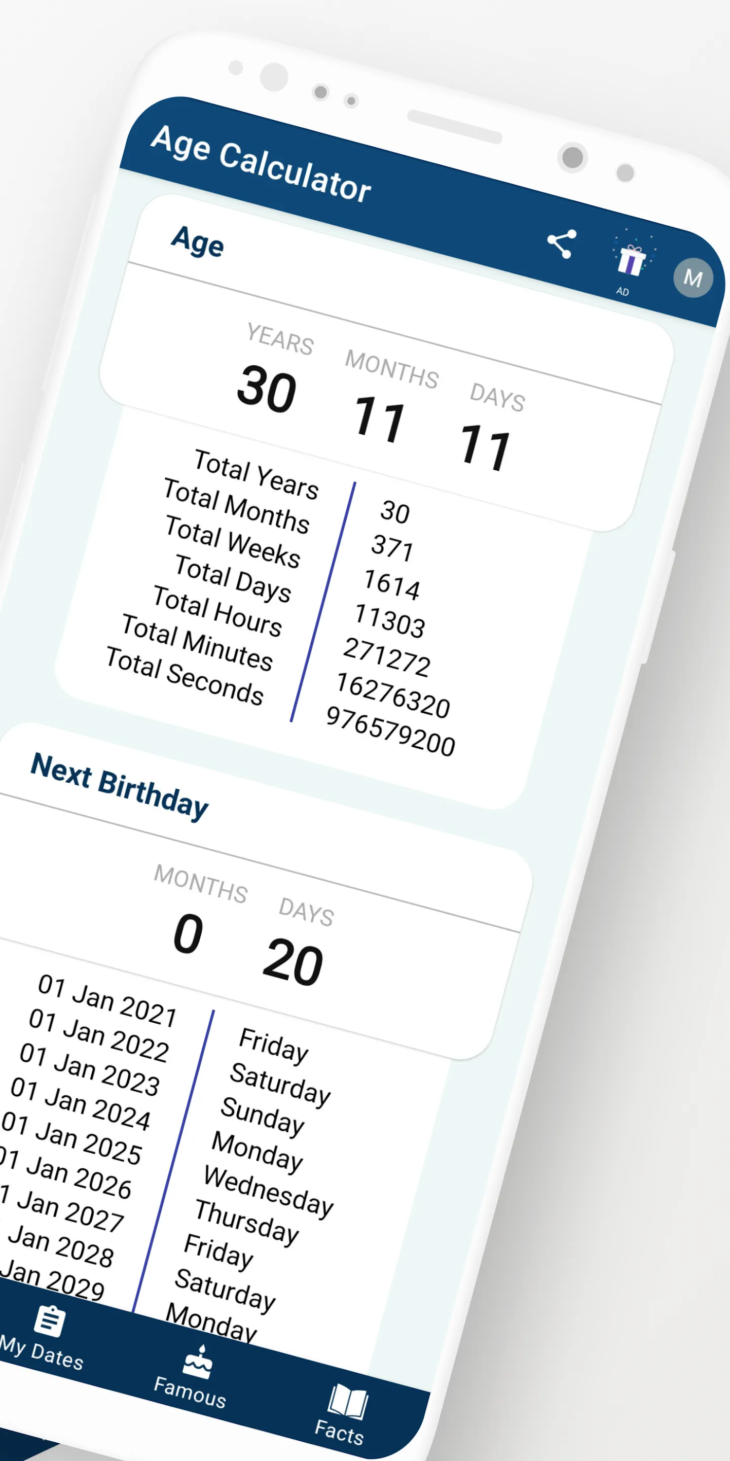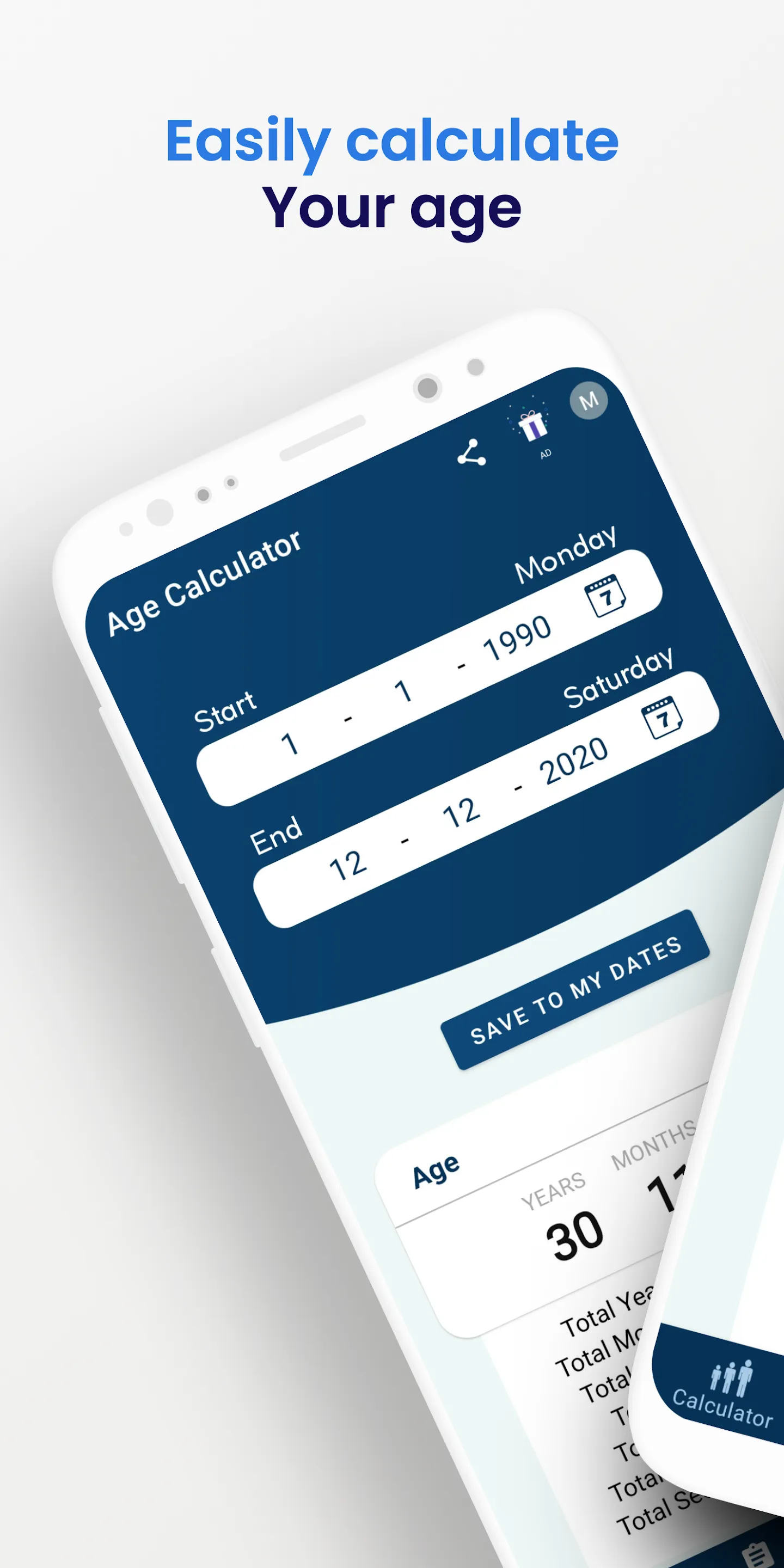 Easily calculate your exact age with Age Calculator! With a simple date of birth, the app calculates your age in years, months, days, and even seconds. Never forget important dates again by saving birthdays and anniversaries within the app. Get reminders for upcoming birthdays and anniversaries, and calculate the difference between two dates down to minutes and seconds.