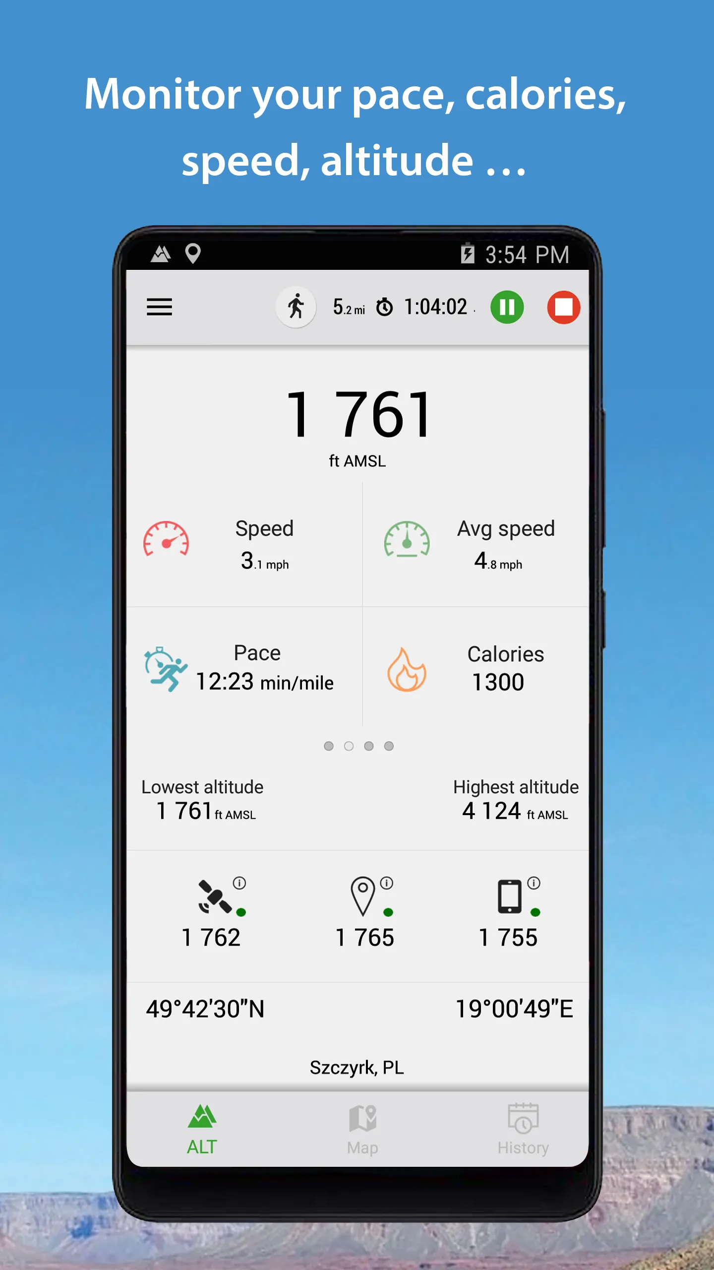 Altimeter is a smart tracking devices, used to altitude measure. It is perfect app for people who love hiking, skiing, mountain biking and other outdoor activities. Any time and with high precision you can check altitude, elevation or localization coordinates. It works online and offline. This altimeter app, to measure altitude uses: - GPS satellites triangulation - works without internet connection, - barometer pressure sensor (if available in your device) - high accurate data; if internet connection is available it calibrates itself to improve accuracy, - online networks location services (wifi and other) - need internet connection....