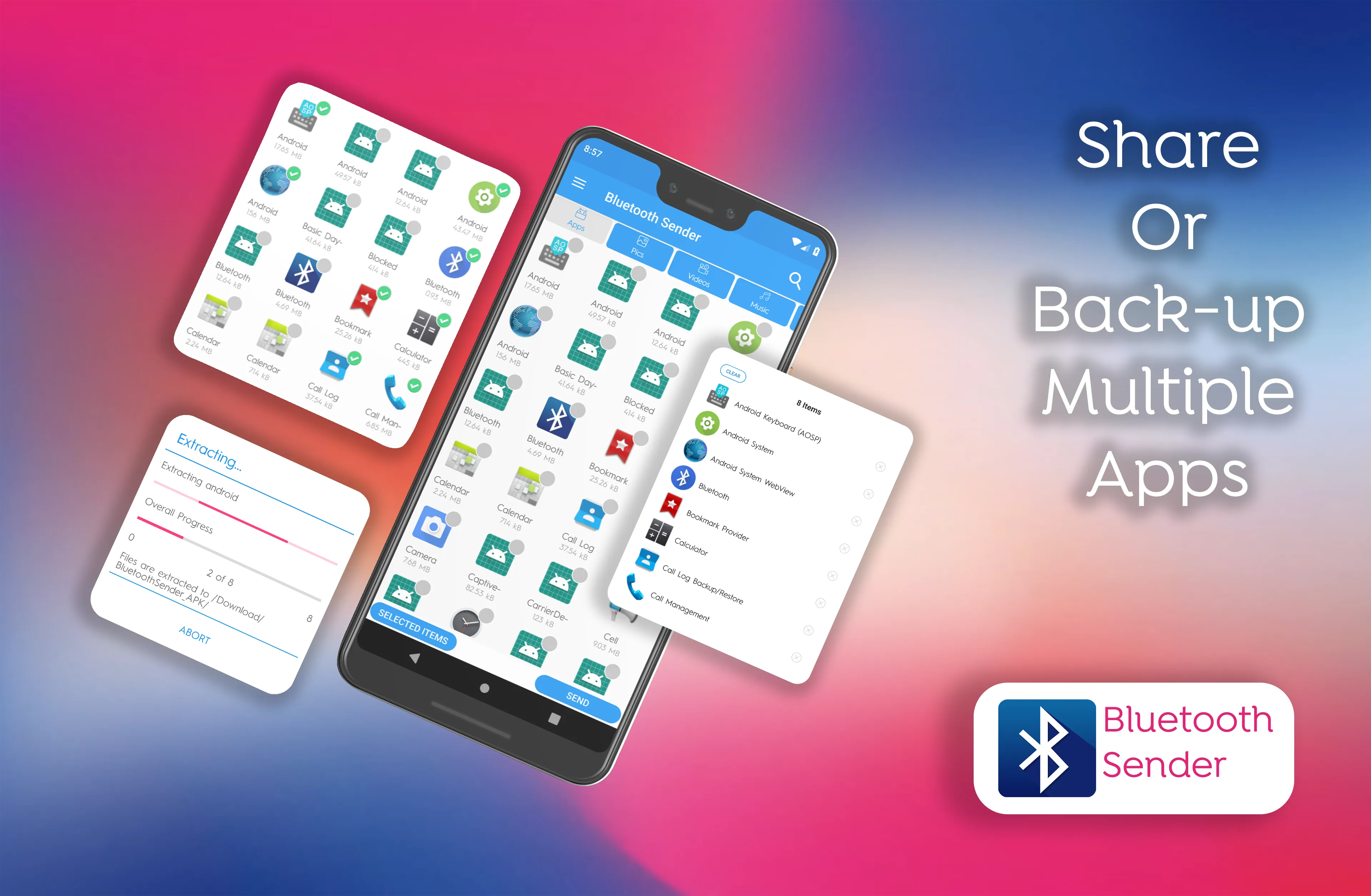 The Bluetooth Sender is one of the most important tool and is like a Swiss Knife which you can easily share your Applications, Audio Files, Video Files, Pictures and all sort of files via Bluetooth. It also enables you to share System Applications. It has also a Sending Bucket™ which keep a list of all the items selected. Through Sending Bucket™, you can easily manage the items to share or transfer. The Sending Bucket™ can be easily accessed through the selected items button. Another convenient and flexible feature of the Bluetooth Sender is that you can select Applications, Audios, Videos, Pictures and all sort of files, all together and share or transfer it. There is absolutely no restriction on what to share or transfer. It has also application extractor (apk extractor), which can easily and efficiently extract multiple applications. This feature is very helpful to back up your apps. The extracted apk file can be easily transfer or shared through email etc. The apk extractor feature can extract more than one apk and shows progress of the overall process very elegantly. With apk extract feature, one can even extract system apps....