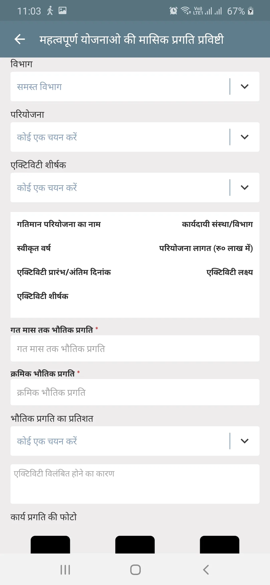 This app serves as complement of portal cmis.up.gov.in which is in place to monitor all project of various government departments with investment in Uttar Pradesh. • Using this app, the officers of executing agency/department can upload physical and financial progress of projects and activities along with geo-tagged images of project site. • The uploaded details is visible on cmis portal to monitoring officers's login