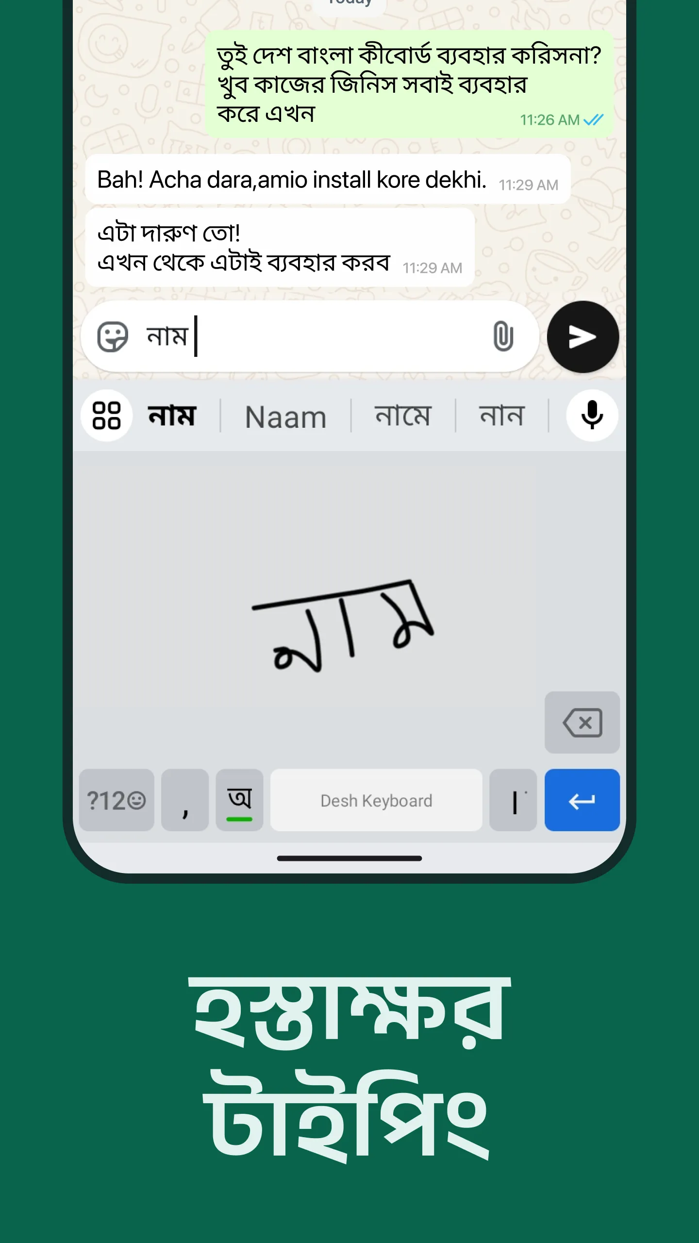 Desh Bangla Keyboard is the most popular app to type both Bangla and English. Different ways to type - Bengali: Type in English and get Bangla words - Voice: Speak and get Bangla with voice typing - Handwriting: Draw and write Bangla letters with handwriting...
