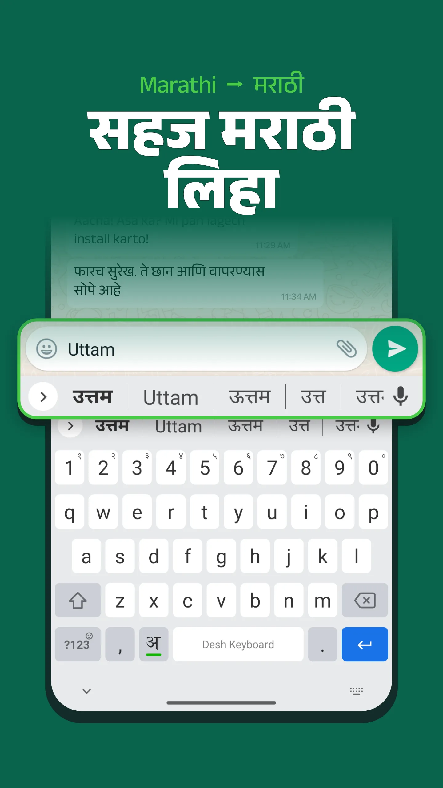 Desh Marathi Keyboard is the most popular app to type both Marathi and English. Different ways to type - Marathi: Type in English and get Marathi words - Voice: Speak and get Marathi with voice typing - Handwriting: Draw and write Marathi letters with handwriting...