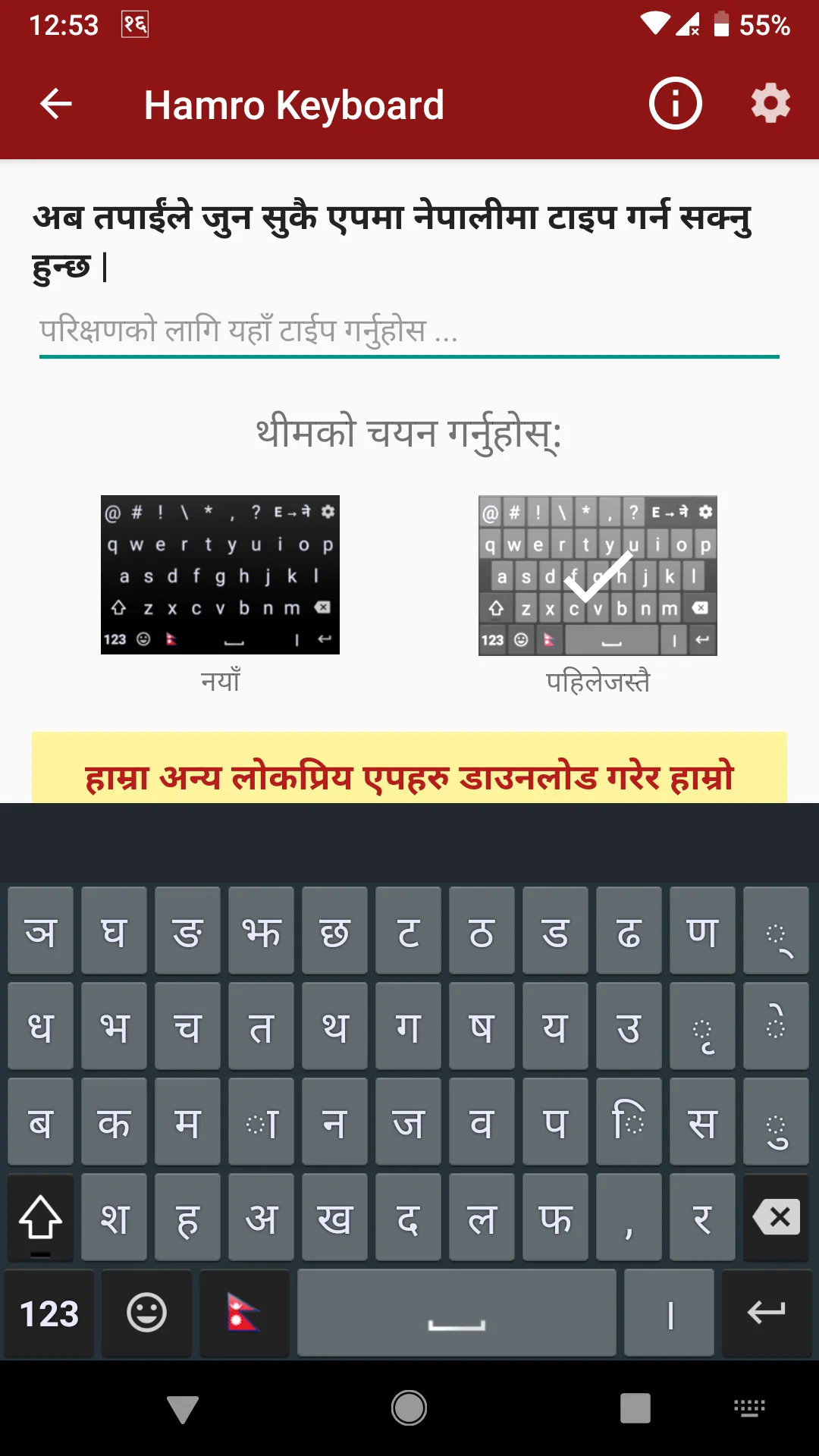Hamro Keyboard is a Nepali keyboard for all of us who love Nepali language. You can use this keyboard to write Nepali text in any app. No need to copy and paste. With Hamro Nepali Keyboard, you can type Nepali directly to any app. We support three keyboard layouts, Unicode Transliteration, MPP based Romanized layout, and traditional layout. We also added Emoji support, Stickers, Themes and Numeric Keypad with the latest update. ...