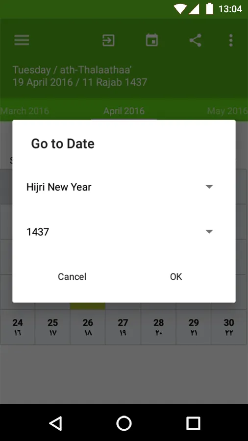 Islamic Calendar (Hijri) is an app for conversion from Gregory date to Hijri. A very useful app for our Islamic and Muslim community to determine the proper days on which to observe the annual fast (Ramadan) and to attend Hajj Features : - Slide next and previous months - Go to specific date - Manual correction - Go to muslim special days - Days remaining on selected date *Date from hijri calendar is an estimation, for Muslim holidays it depends on your local announcement on Ru'yatul Hilal.