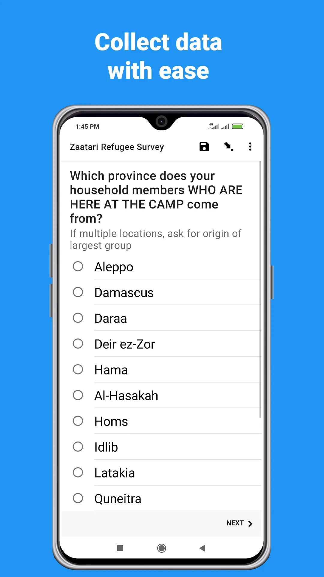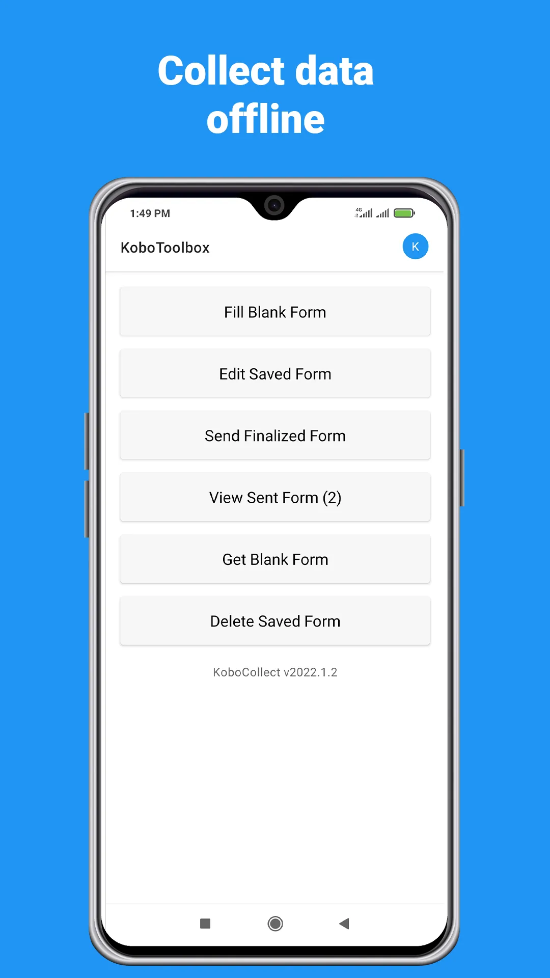 KoboCollect is the free Android data entry app for use with KoboToolbox. It is based on the open source ODK Collect app and is used for primary data collection in humanitarian emergencies and other challenging field environments. With this app you enter data from interviews or other primary data -- online or offline. There are no limits on the number of forms, questions, or submissions (including photos and other media) that can be saved on your device. This app requires a free KoboToolbox account: Before you can collect data create a free account with your computer on www.kobotoolbox.org and create a blank form for data entry. Once your form is created and active, configure this app to point to your account, following the instructions in our tool. To visualize, analyze, share, and download your collected data just go back to your KoboToolbox account online. Advanced users can also install their own KoboToolbox instance on a local computer or server. ...