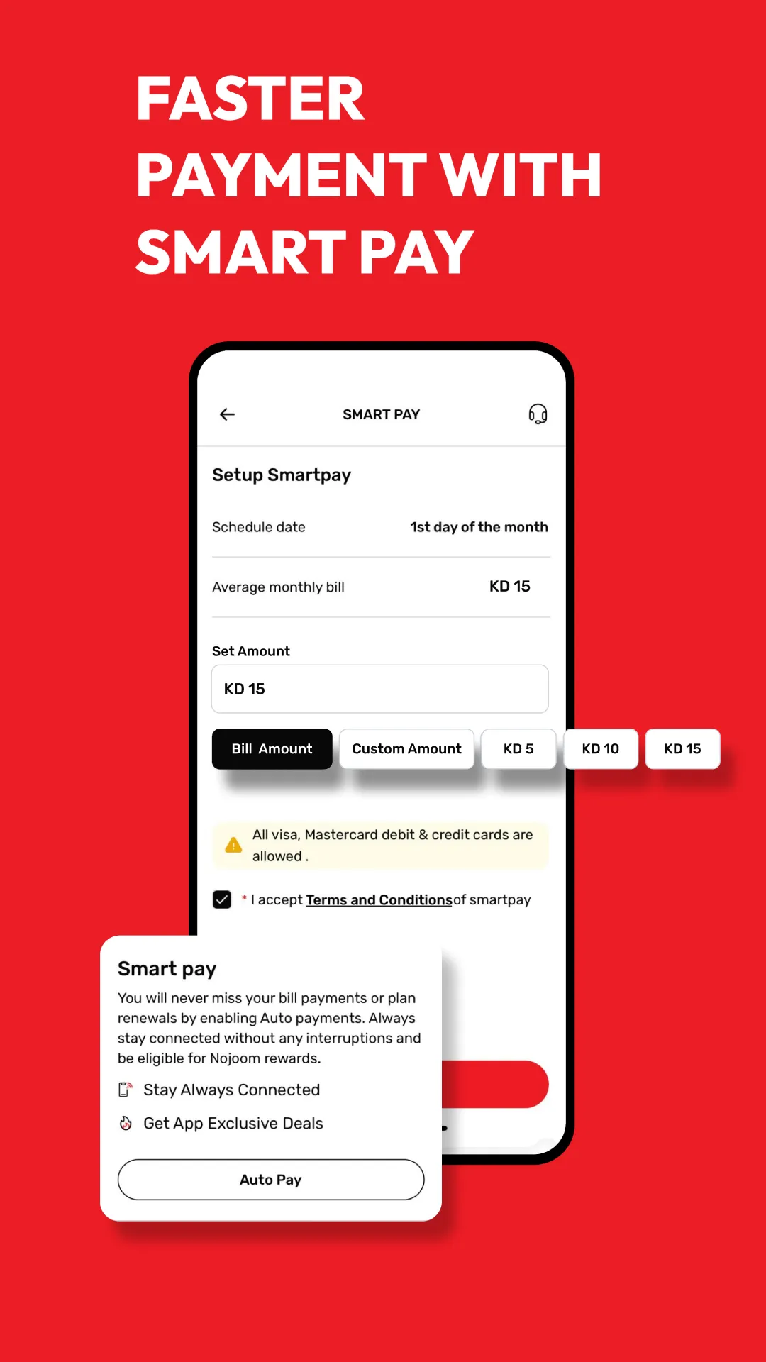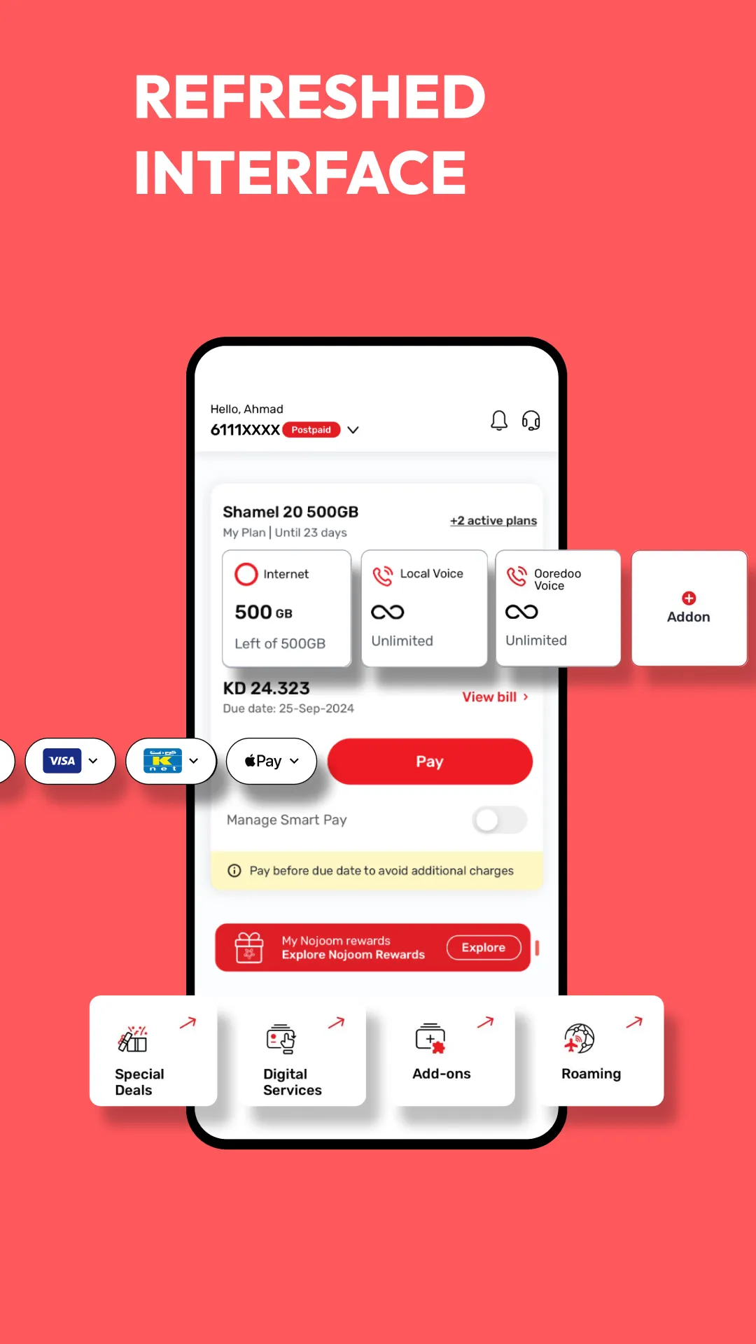 Ooredoo Kuwait app provides you a quick and easy way to check your balance, Recharge your prepaid numbers, Pay your postpaid bills, Transfer Balance and Shop the latest exclusive offers & exciting deals on mobiles, devices and Shamel, Xpress & ANA SIM plans or even get an eSIM. Through our App, you can Manage all your lines at once, Track your minutes, SMS & internet usage real time, and stay connected by purchasing Addon bundles. You can also customize your ANA plan to meet your needs It gives you the ability to Upgrade to 5G internet, Subscribe to Roaming and International services easily with one click and no commitments needed. You can also manage your Nojoom Points redemptions and check the latest Nojoom Deals. Don’t miss out on the Incredible Offers of Ooredoo Surprise. ...