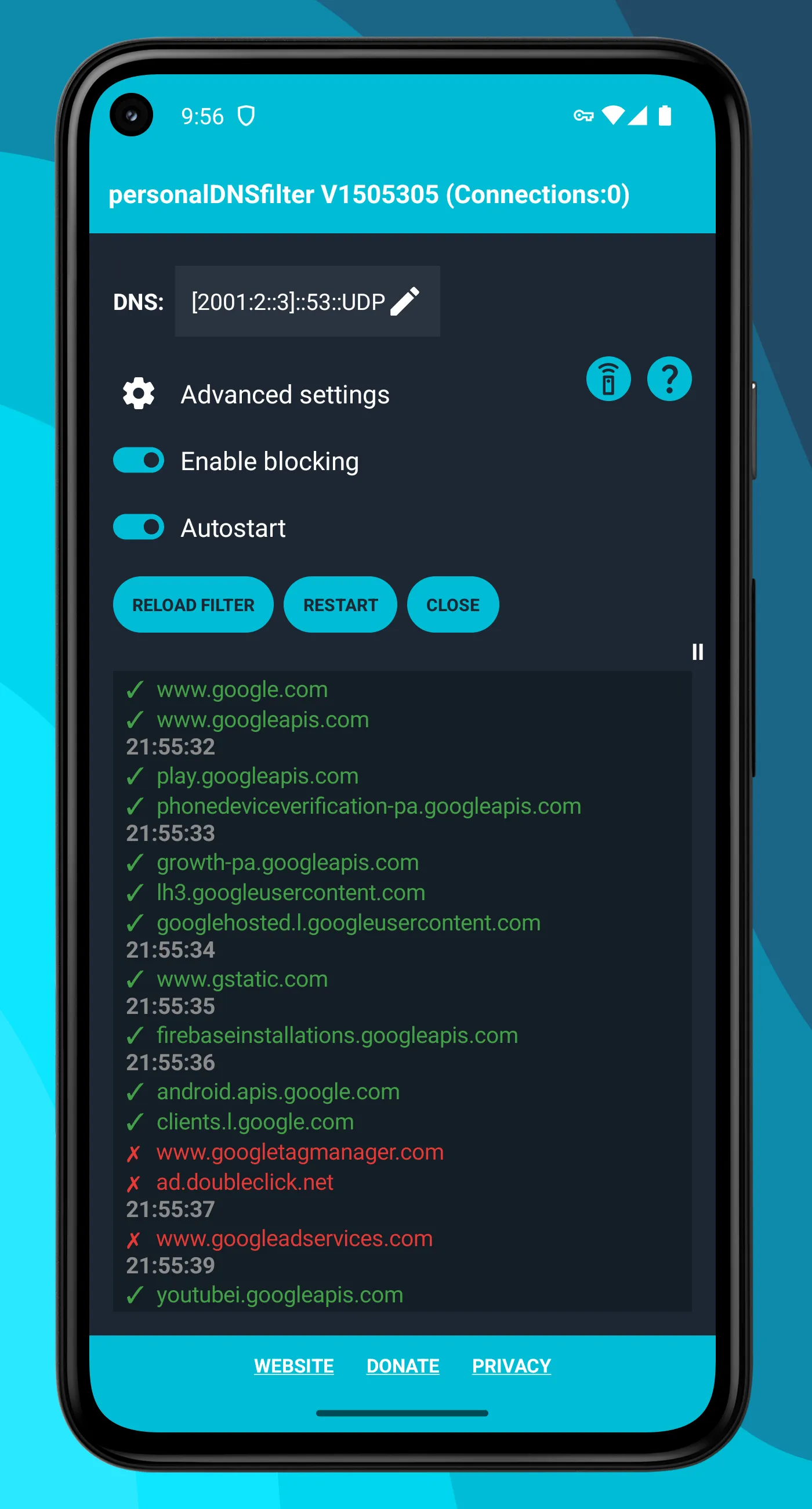 personalDNSfilter - a DNS filter with encrypted DNS support - for your privacy. personalDNSfilter is a DNS filter app for Android. It hooks into the domain name (DNS) resolution and blocks access to filtered hosts. It can be used for filtering any unwanted hosts which are related to malware, phishing, tracking and more based on a host list. It will be an eye opener, when you see the personalDNSfilter live log showing all the different domains accessed from your mobile under the hood. ...