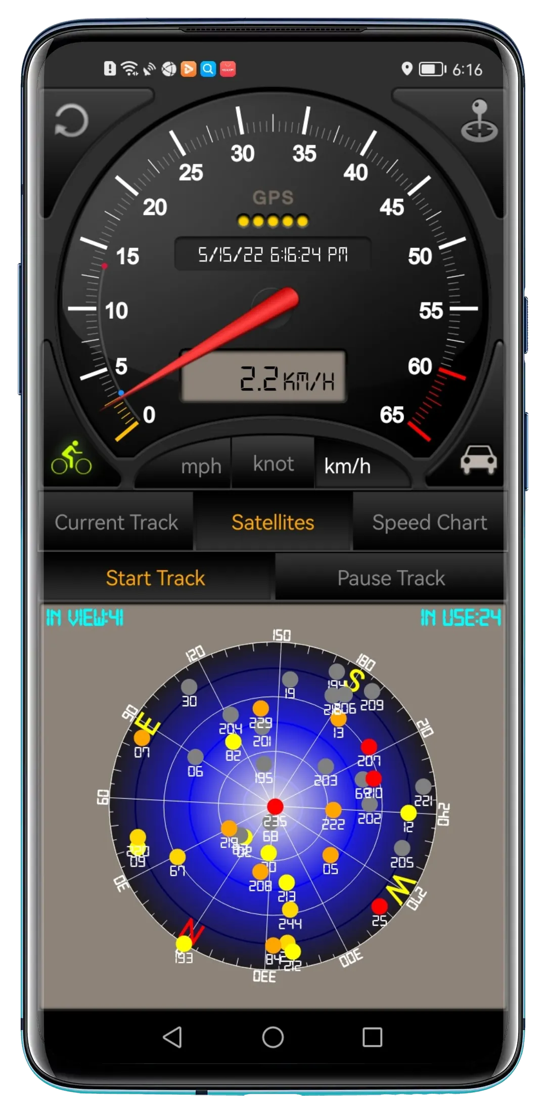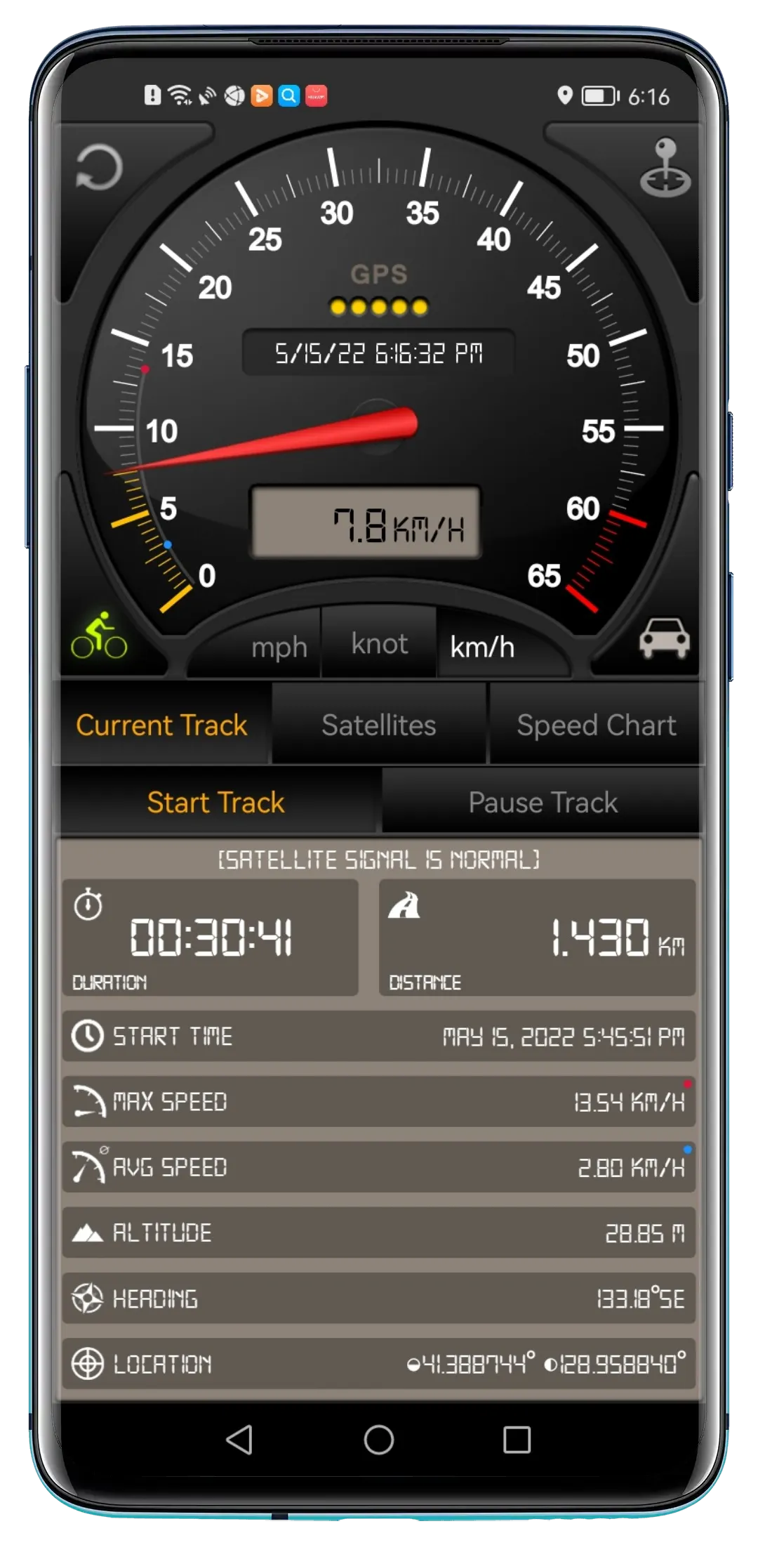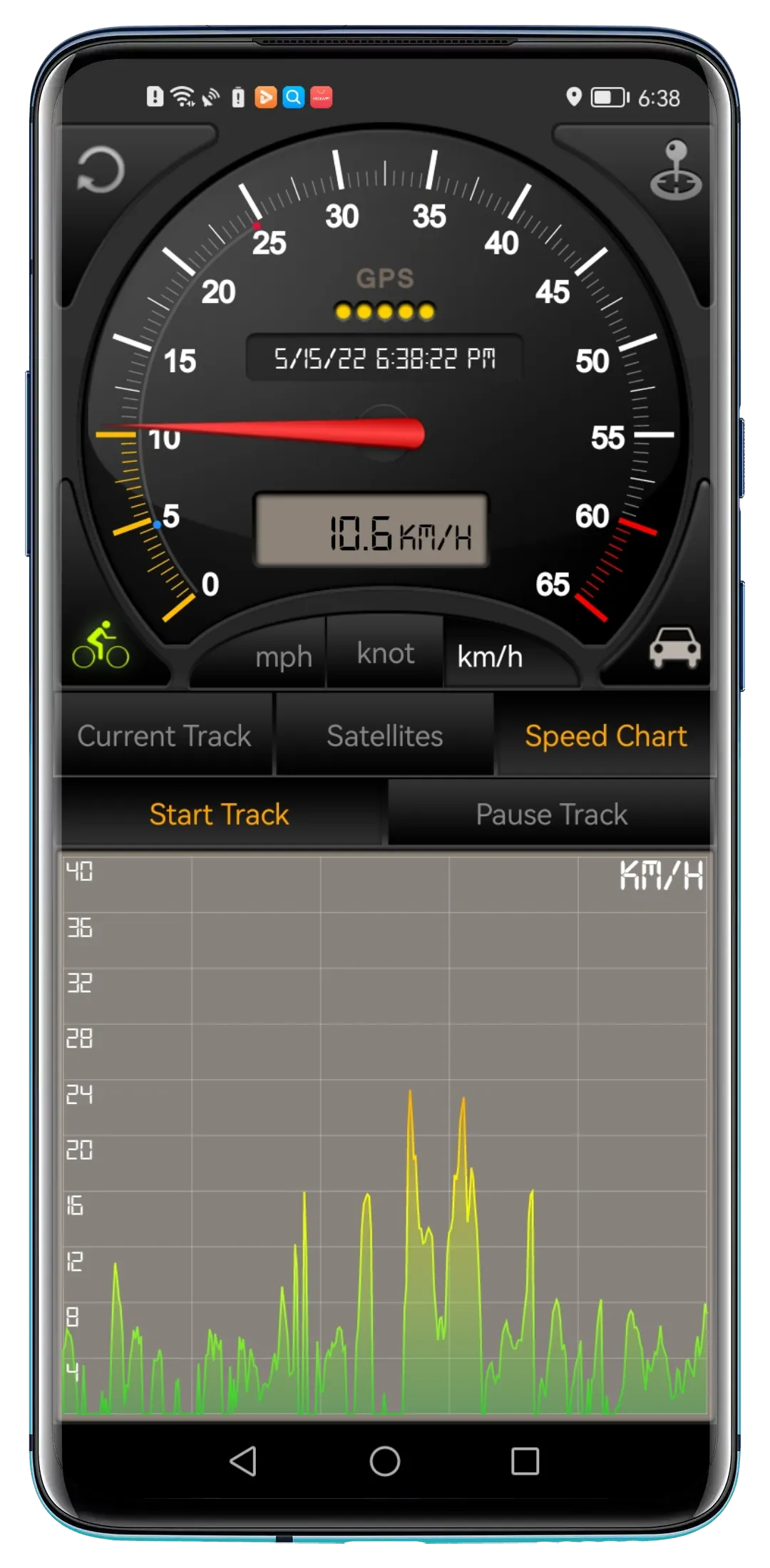 Speedometer GPS can track your speed,distance,time,location and also can get start time,time elapsed,avg speed,max speed,altitude... Features included - Save your track info. - Switch between car speedometer and bicycle odometer. - mph,km/h,knot. - Display satellites status. - Speed chart. - Map integration, get your location. …… Facebook:https://www.facebook.com/SpeedometerGPS If you have translation suggestions, please contact me! [email protected]