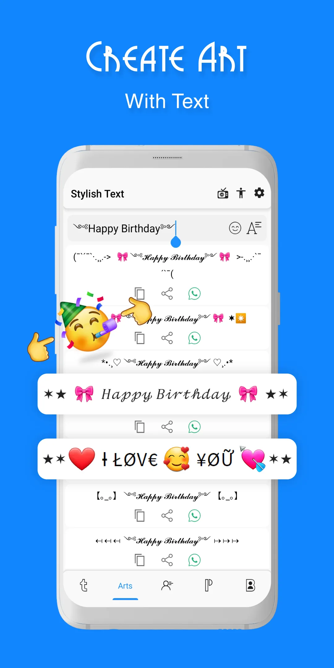 Stylish Text app add a touch of style to your messages when chatting with your friends by using pre-made decorative text. Stylish Text is handy and incredibly easy to use. Write Stylish Text and Art and share them in your favourite chat app like WhatsApp, Snapchat, Instagram, Facebook, Hangouts and every other app which supports editing text to impress everyone. ...