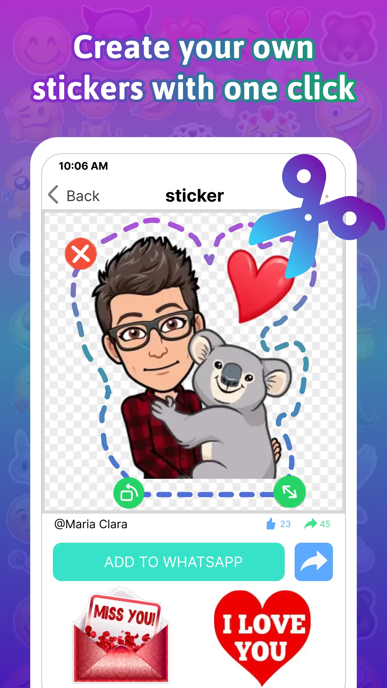 "🎉Massive sticker factory: Love stickers, animal stickers, holiday stickers, cute stickers, funny stickers and other stickers are free to use. Live stickers and static stickers are your choice! 🤩Superb automation technology: Create stickers from your photos in a second with the new auto-cut technology. ✔️One-click to add to your WA: No need to switch software, one-click production and export, very convenient! 🔍Continuous update: New stickers are updated in real time every day, all of which are free to download. 🎊Very simple operation: simple and clear page, let you experience the pleasure of swiping pictures...