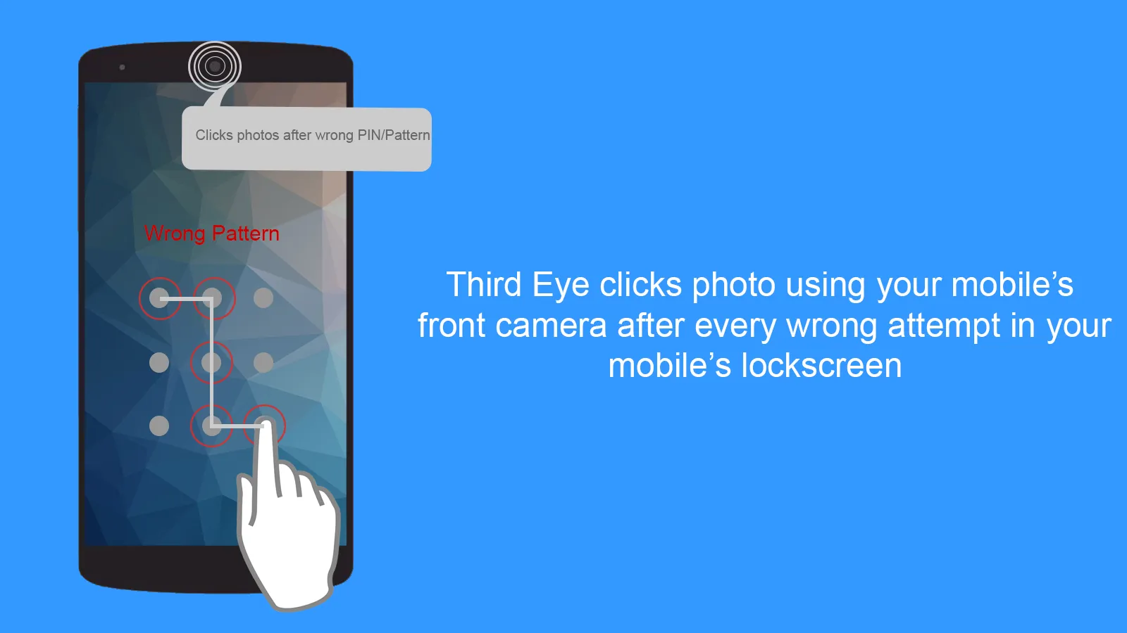 Use Third Eye and catch all the mobile snoopers with ease. The Third Eye app will ease your task of catching your friends and family while they try to access your mobile. Third Eye will take a photo while someone tries to access your mobile with the wrong PIN, Pattern, or Password. You can catch the snoopers red-handed using this app. It provides a lot more cool features. Features : 1. The app automatically takes a photo while someone enters the wrong PIN, Pattern, or Password. 2. Notification about wrong attempts while you unlock the lock screen. 3. Last Unlock Time feature will show you the previous lock screen unlock time. With that, you can easily find if someone used your mobile without your knowledge....