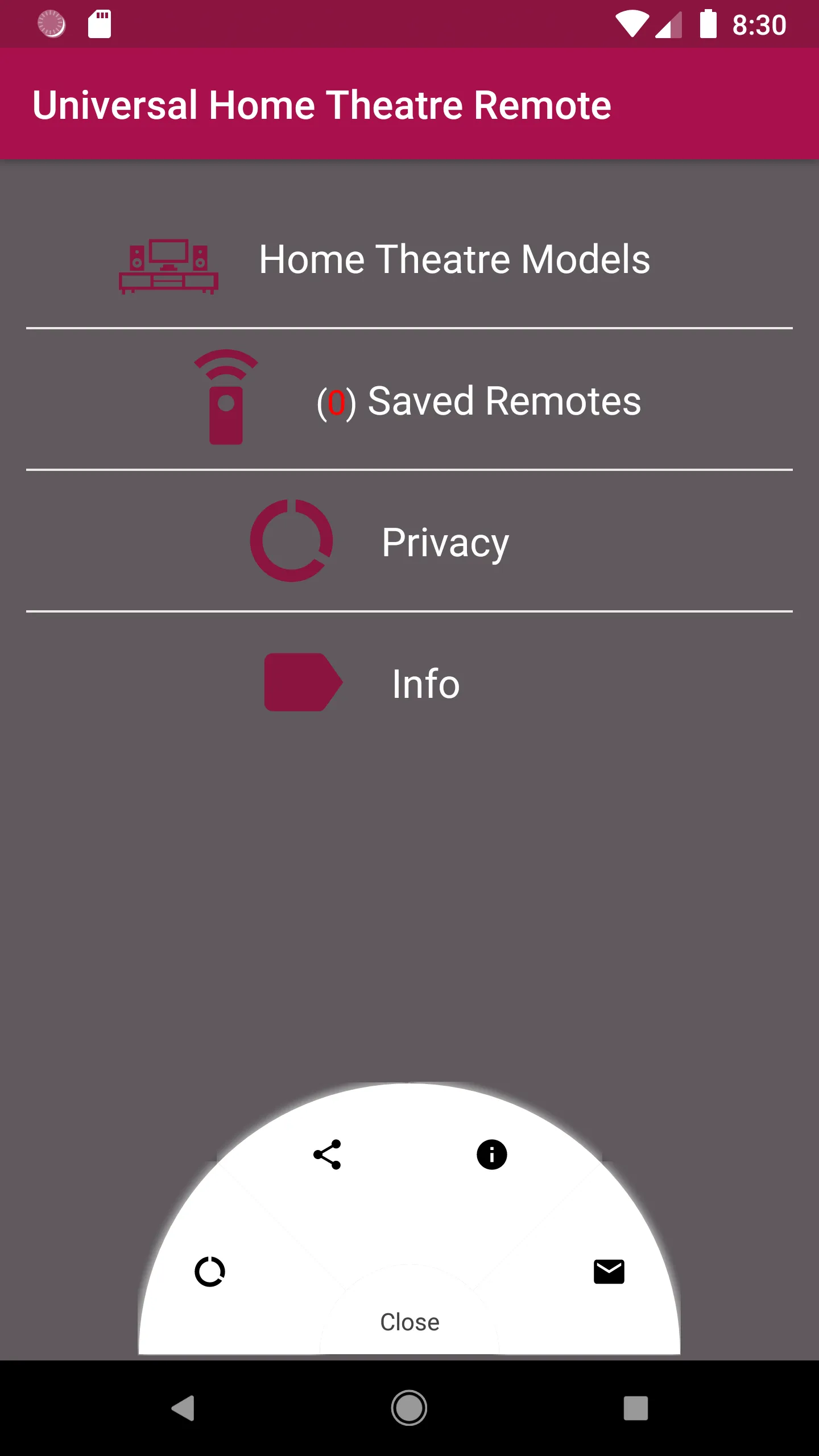 This Remote Control for Home Theatre devices contains 100 plus Home Theatre Remotes, some of them are the following. Start Using your Android Phone as a Remote now. Your Kids have broken the remote or the batteries have drained or your pet has eaten your remote. This is the Remote which will always be in your pocket. > Samsung Home Theatre Remote Control > Sony Home Theatre Remote Control...