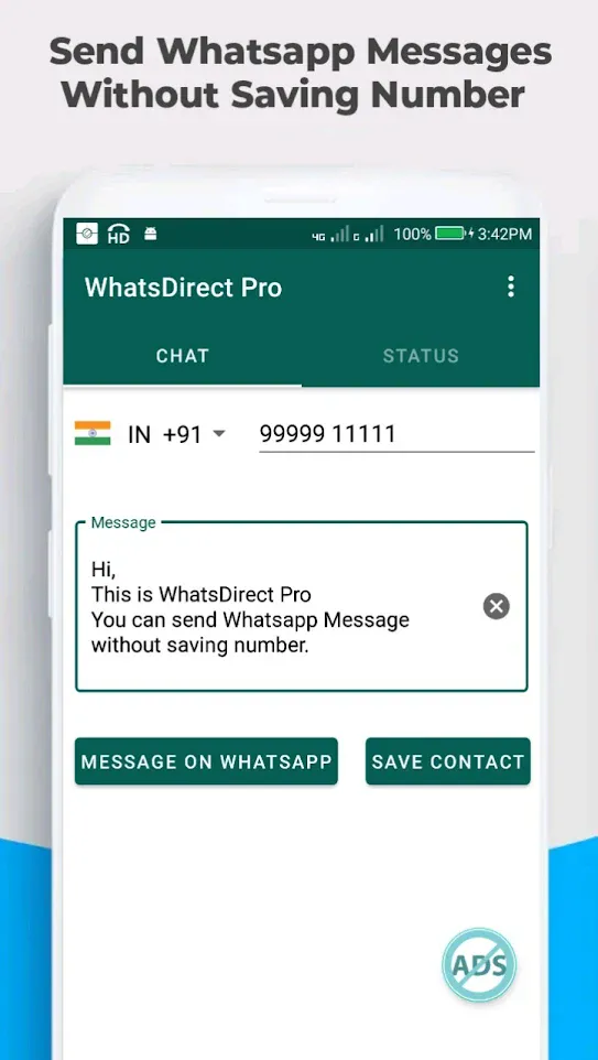 WhatsDirect Pro - (Direct Chat & Status Downloader) is a app to WhatsApp directly without saving unknown numbers. Direct message supports mobile number entering as well as copy paste from call logs facility to enter mobile number. - How it works? 1. Enter a number or copy paste from call logs to which you are going to send message. 2. Tap on Send button to open official WhatsApp app. 3. This will take you to the official WhatsApp app then a chat window is created with given number....