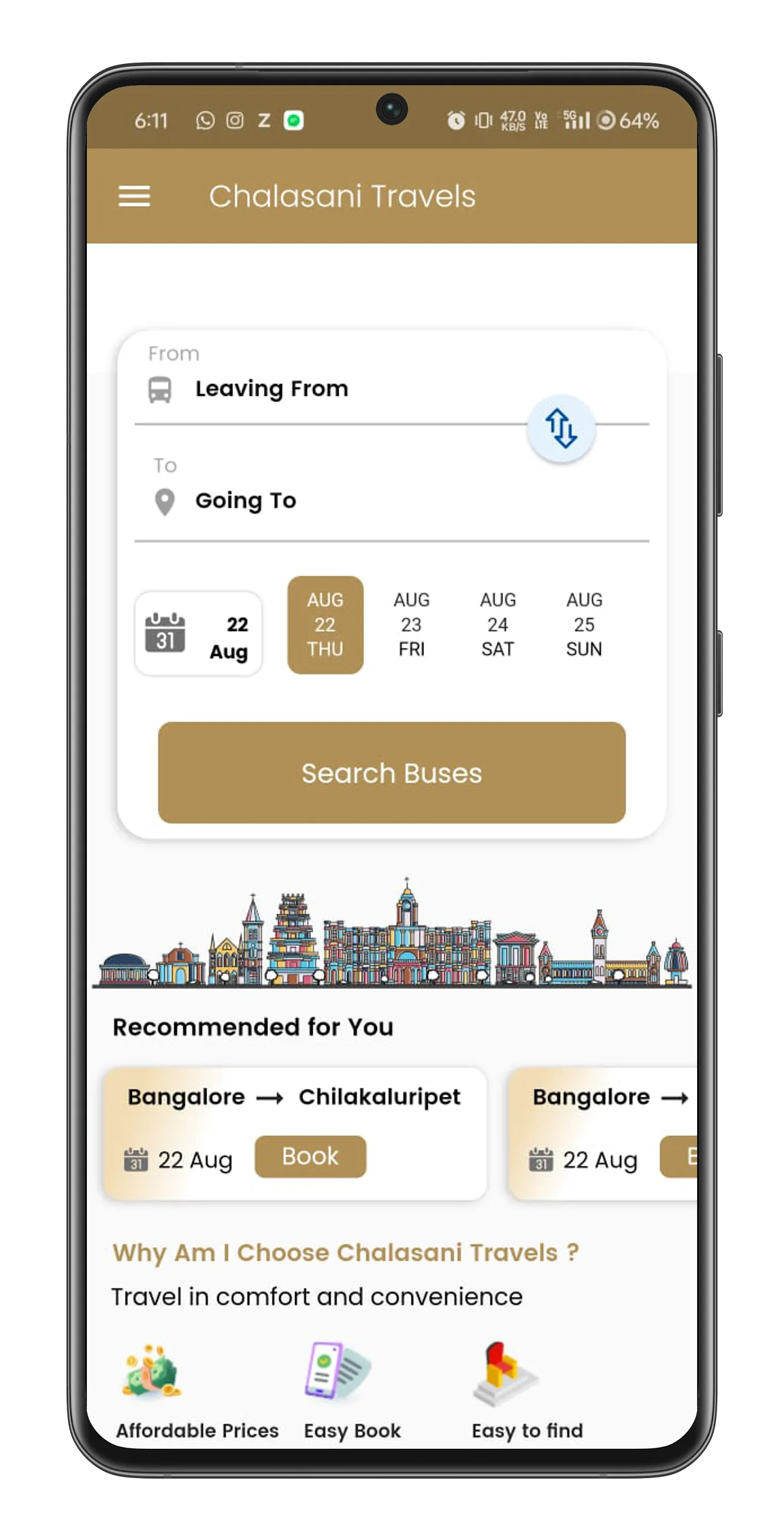 Online bus tickets booking application for Chalasani Travels. This app designed for book, cancel bus tickets in Chalasani Travels, also allows to manage already booked tickets history in Chalasani Travels. Book bus tickets to Tirupati, Bangalore, Guntur, Vijayawada, Ongole in Chalasani Travels.