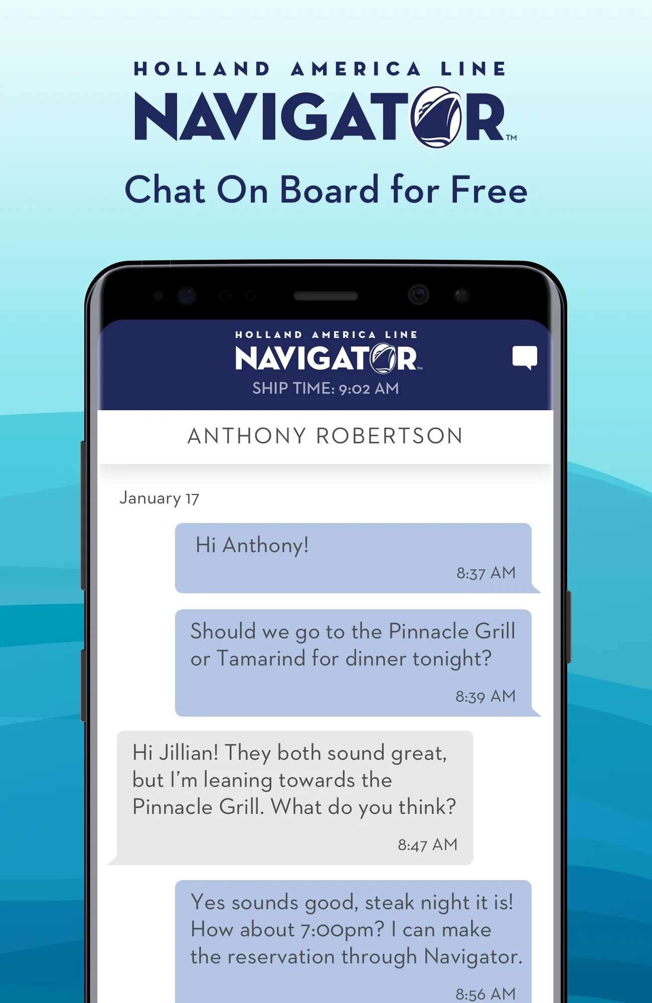 Log in with your Hollandamerica.com account and get access to your current profile and information, and all of your past or upcoming bookings. Before your cruise, you can review all the services available to guests, check out events and shore excursions planned for your trip, and review an interactive Holland America Line fleet map to see the destinations where our ships sail. Once on board, connect to the ship’s WiFi to view dining menus, spa services, shore excursions, chat with other guests and more at no additional charge. (An onboard Internet purchase is NOT required to use the Navigator app.) ...