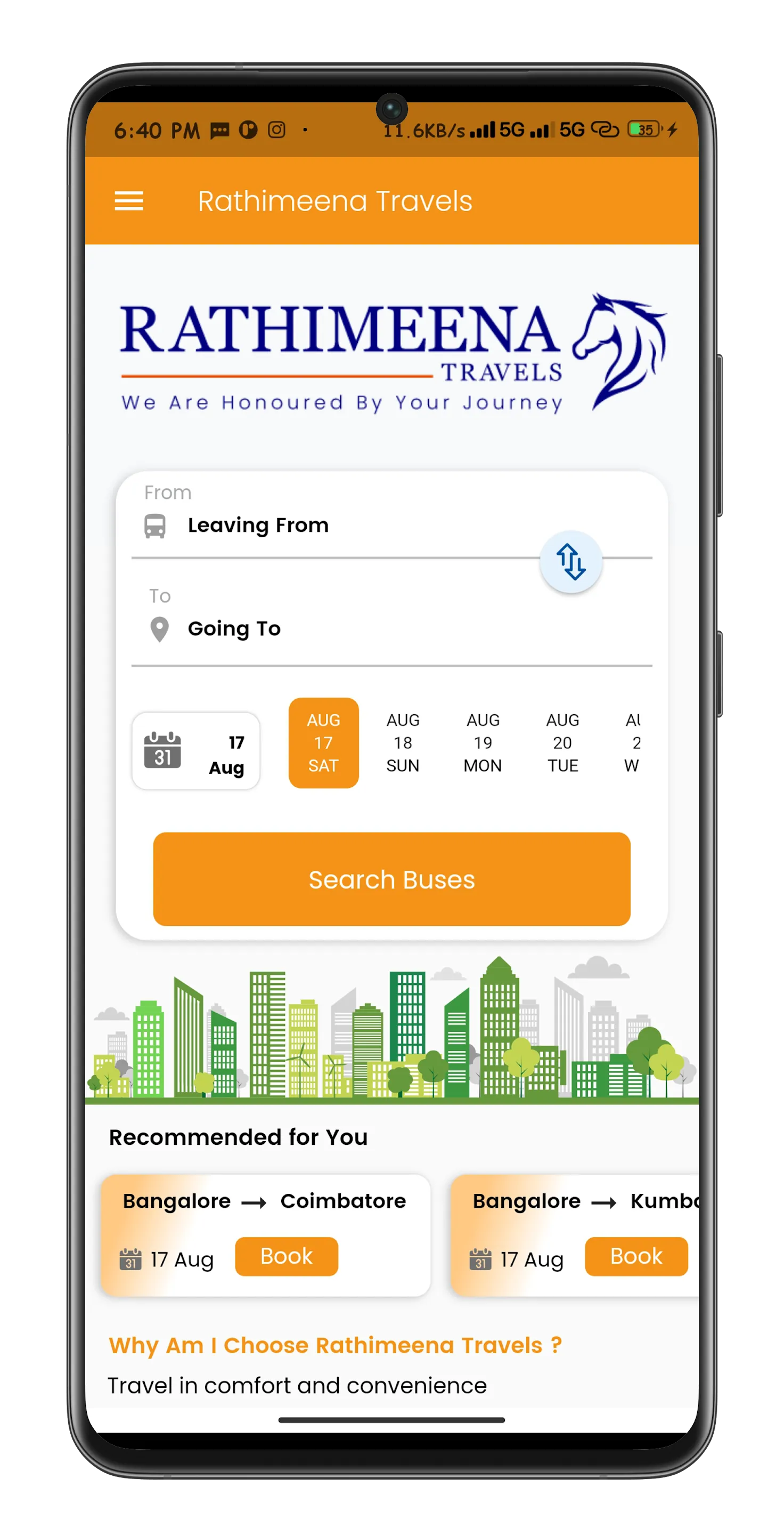 Online bus tickets booking application for Rathimeena Travels. This app designed for book, cancel bus tickets in Rathimeena Travels, also allows to manage already booked tickets history in Rathimeena Travels. Book bus tickets to Bangalore, Chennai, Chidambaram, Coimbatore, Kulasekaram, Kumbakonam, Nagercoil, Tanjore, Velankanni in Rathimeena Travels.