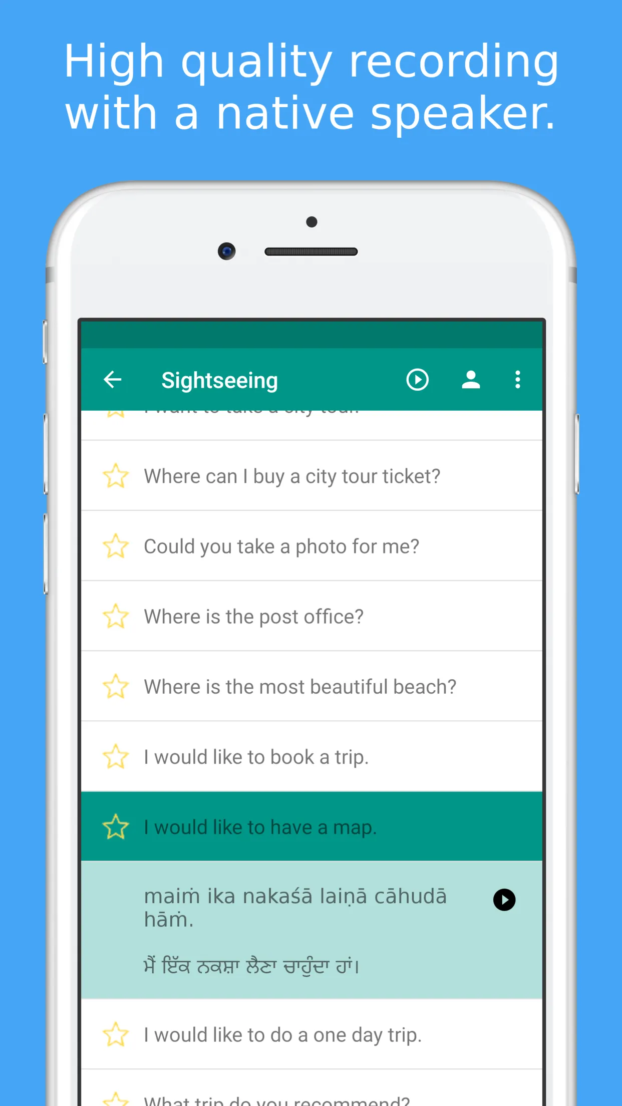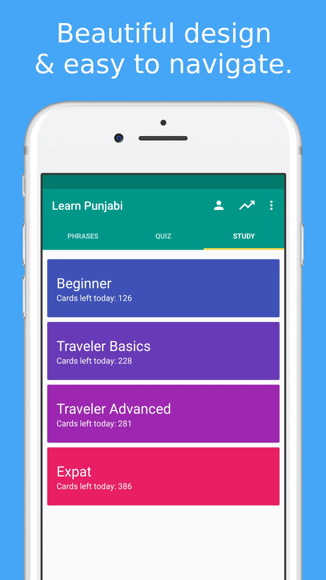 ★★★ Learn Punjabi language when visiting India ★★★Simply Learn Punjabi Language App is a FREE language app that will assist you to speak Punjabi quickly and effectively.All Punjabi phrases and words are presented to you in both phonetic and original Punjabi writing. They are recorded by a native speaker from India.Save your favorite phrases and words to review them without fuss.Study your vocabulary with flashcards using the spaced repetition technique.Test your knowledge with fun Punjabi language quiz and review your score.★★★ Survive when travelling in India ★★★ Use the Punjabi phrasebook to survive in India. All important survival phrases are included.For example, let the app speak to the Taxi driver in India to show them where you want to go.Search all phrases and words to quickly access what you need.★★★ Main Features ★★★✓ 300+ free Punjabi phrases and words ✓ Recorded by a native speaker from India ✓ High quality audio ✓ Spaced repetition learning system ✓ Punjabi quiz to review your skills ✓ Track your learning progress...
