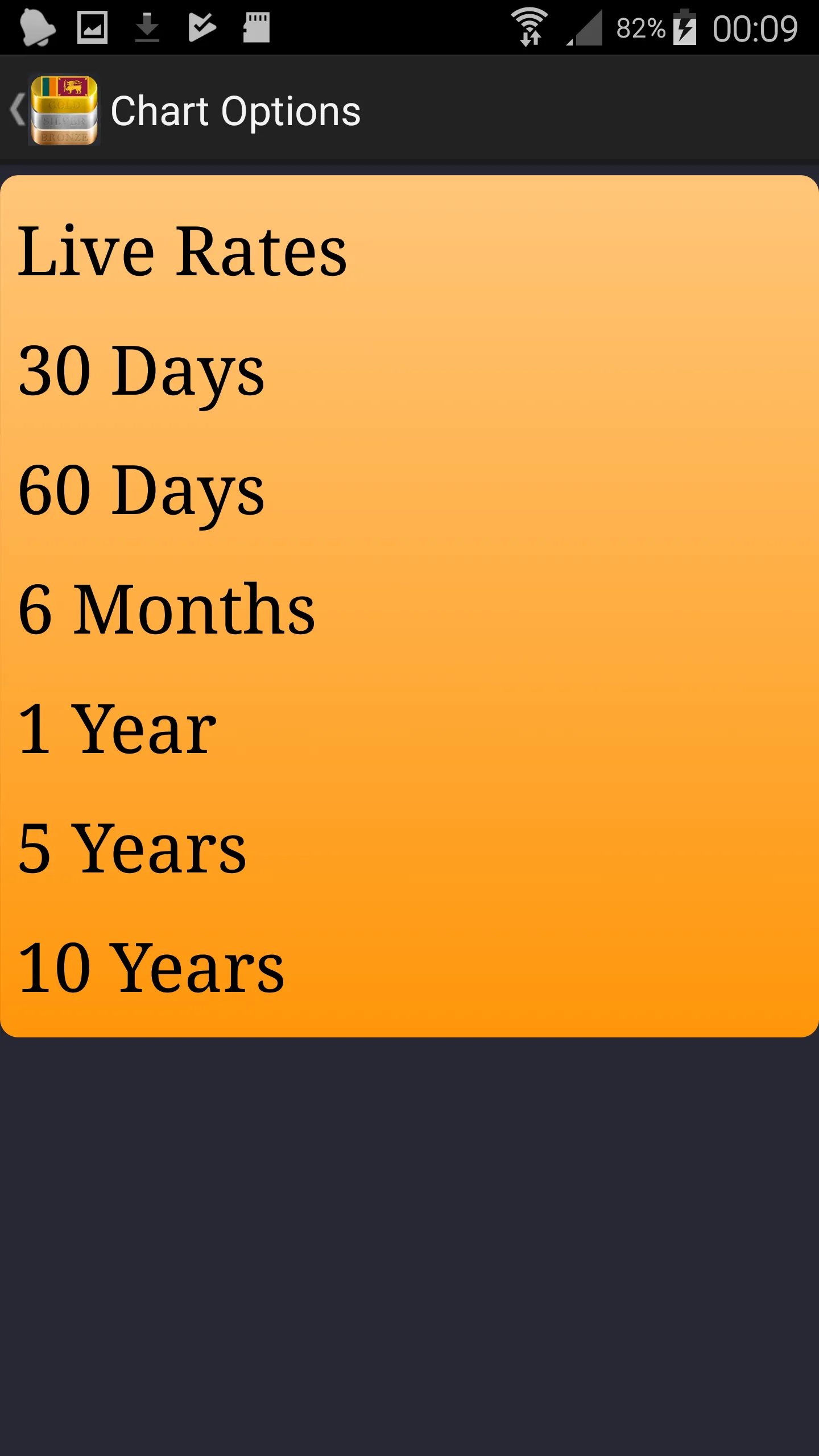 This app provides local gold price in all cities of Sri Lanka. Internet connection is required to run this app. Features: - English - Currencies Sri Lanka Rupee (LKR) - Karats 24k, 22k, 21K, 18k, TT Bar and more...
