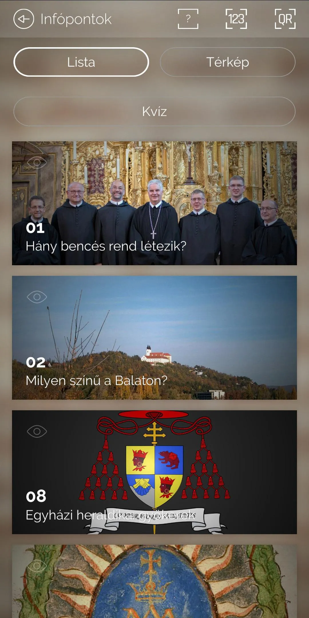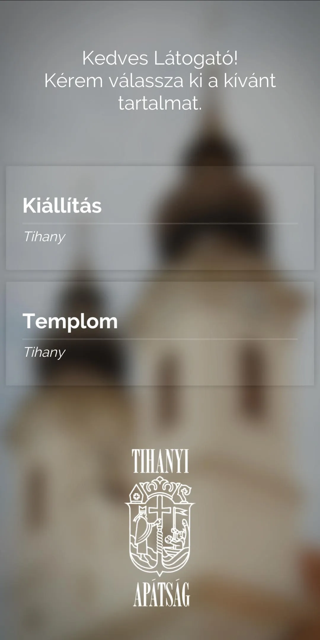 The virtual exhibition tour guide application of The Spirit moved upon the face of the waters - Past and present meet at the Tihany Abbey The application guides the visitor through the Tihany church and the exhibition on the Benedictine order. You are able to access different interactive and informational materials at the individual info points. You can navigate with the help of the interactive map or by choosing your topic of interest from the list view.
