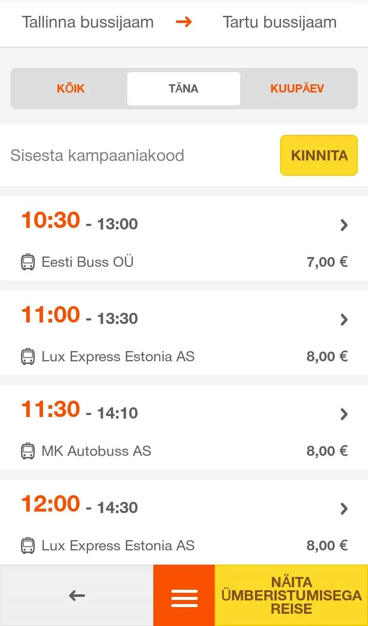 Buying tickets for long distance bus lines with Tpilet is as simple as it can get. You can pay for your tickets with a single tap payment (credit card), carrier billing, internet bank payment or by using Tpilet corporate client account. All purchased tickets are stored in your phone from where you can present it at the boarding. Tpilet app also enables you to return and refund your tickets in case your travel plans should change. Also, a log of all previous tickets purchased for past trips is kept in the app so you can review them later. With Tpilet app you can get advantage on dicounts and campaing tickets provided by various bus operators. It also enables you to get discount by entering bonus code or loyality card (for example PINS card for Lux Express lines). Tpilet app also gives you up to date information on Estonian county and regional busline timetabeles. ...