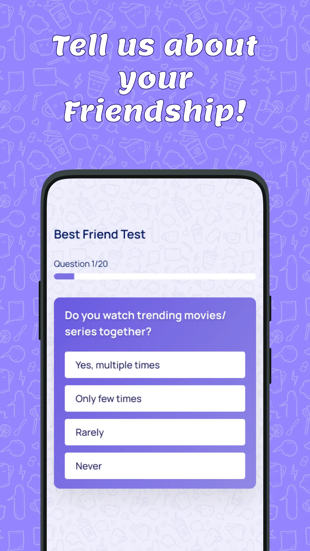 ๐ค Have you ever wondered who your best friends forever are? If you're curious to find out, we've got the perfect solution for you! ๐คฉ ๐ Welcome to the ultimate BFF Test, a fun and verified Best Friend Test that will put your friendship to the test. ๐ต๏ธโโ๏ธ๐ Get ready for a journey filled with laughter, surprises, and heartwarming moments that will strengthen the bond you share. ๐๐ ๐ Unlock the secrets of your friendship as you immerse yourself in an extraordinary quiz experience like no other. ๐๐ With meticulously crafted questions and exciting challenges, you'll delve deep into the depths of your connection and uncover hidden memories that will make you laugh, reminisce, and reinforce your bond. ๐ค๐ ...