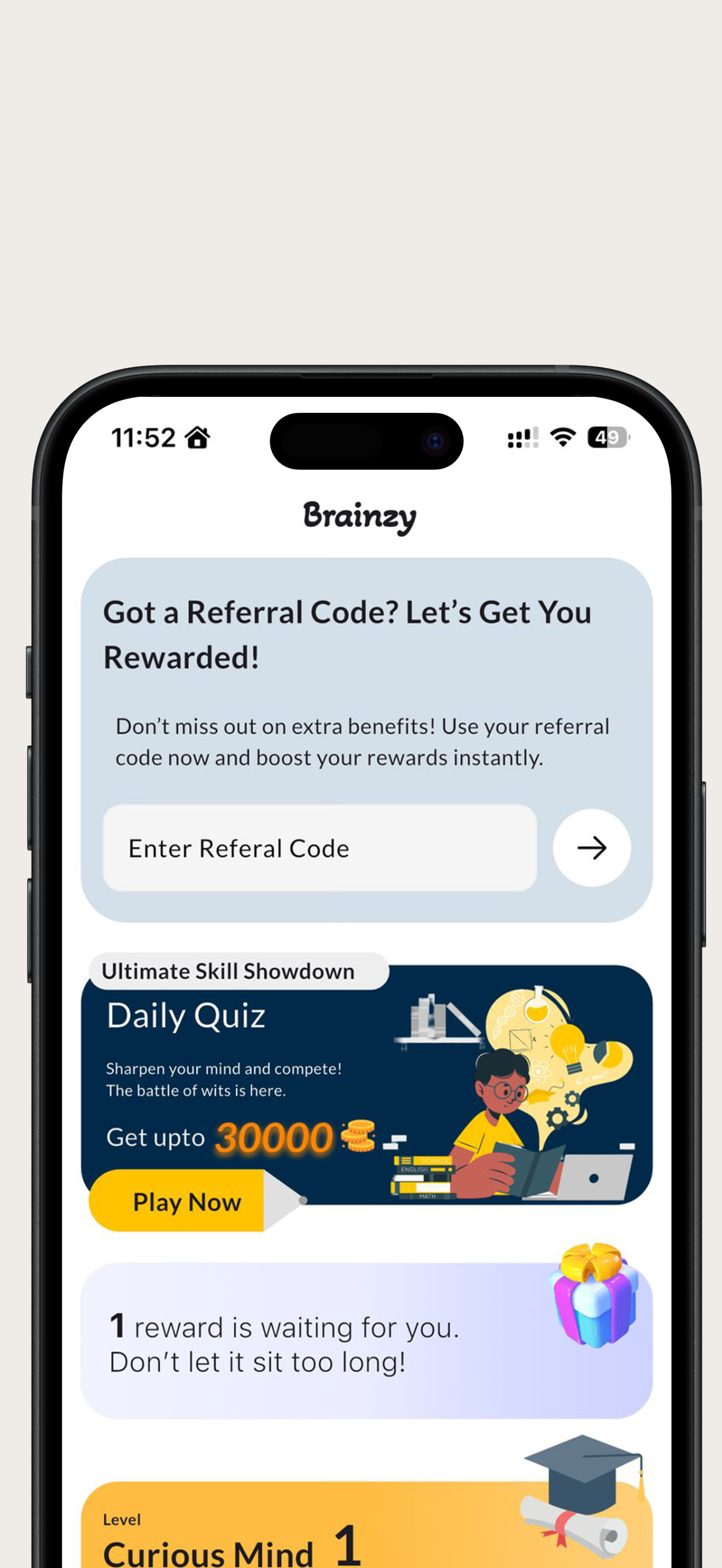 Challenge your mind. Earn rewards. Grow every day. Brainzy is more than just a quiz app. It is your daily companion for learning, fun, and achievement. Whether you are testing your general knowledge, improving memory, or exploring new topics, Brainzy makes every session exciting and rewarding. Why you will love Brainzy: • Play engaging quizzes across multiple categories that keep you sharp....