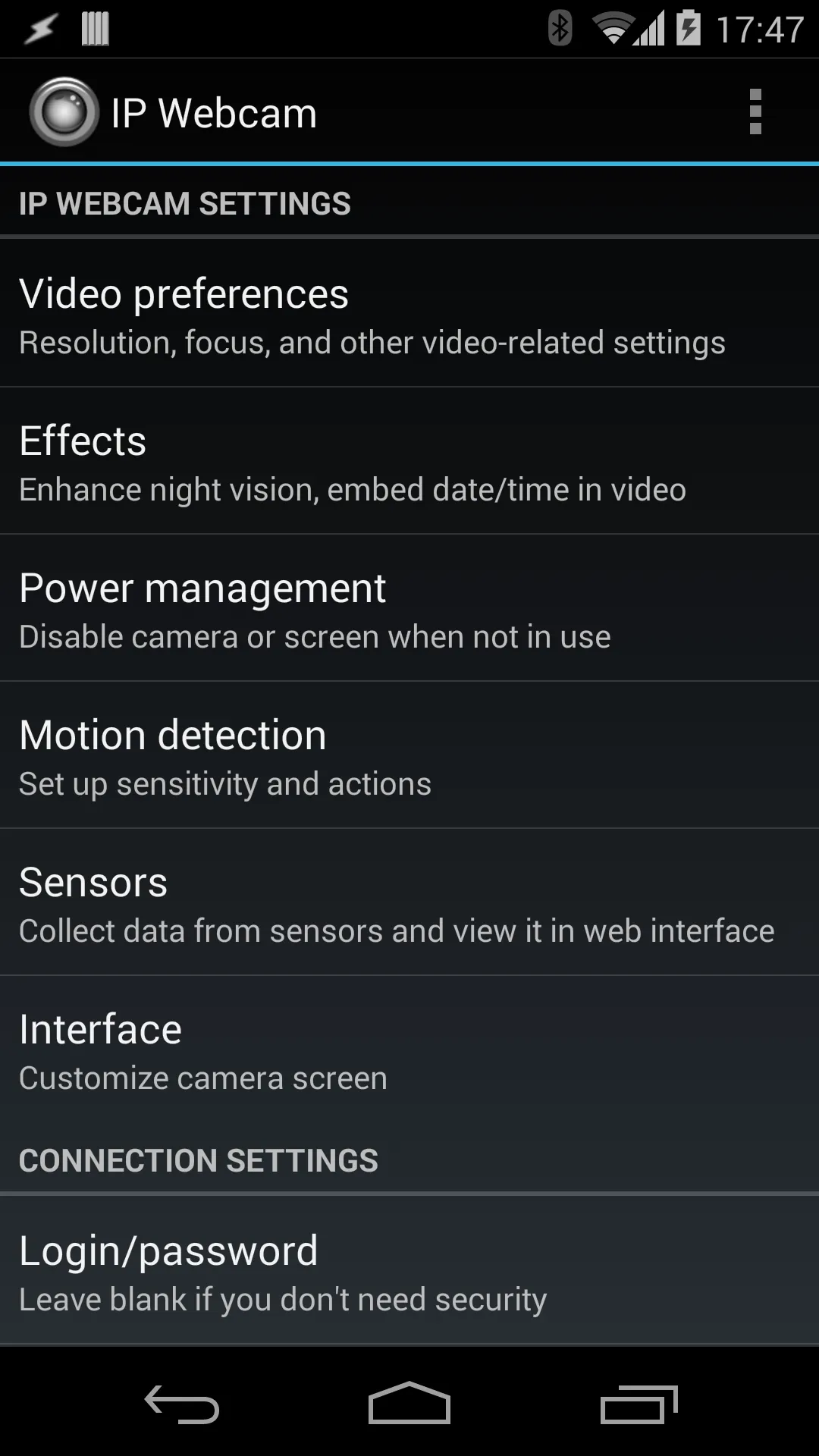 IP Webcam turns your phone into a network camera with multiple viewing options. View your camera on any platform with VLC player or web browser. Stream video inside WiFi network without internet access. Optional Ivideon cloud broadcasting is supported for instant global access. Two-way audio supported in tinyCam Monitor on another android device. Use IP Webcam with third-party MJPG software, including video surveillance software, security monitors and most audio players. ...