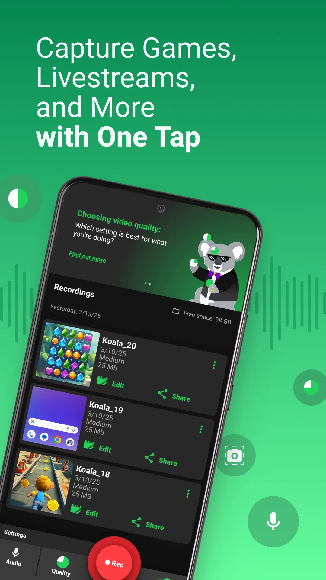 🎥 Record your screen with Koala! 🐨 The simple yet powerful screen recorder with audio and no watermark! Koala is a video recorder for your screen that records with internal audio, music and microphone. Capture every last detail or go for a super small file size to share & send via email. 🎮 Record game action 🖥️ Record online meetings 📊 Record webinars, lectures ...