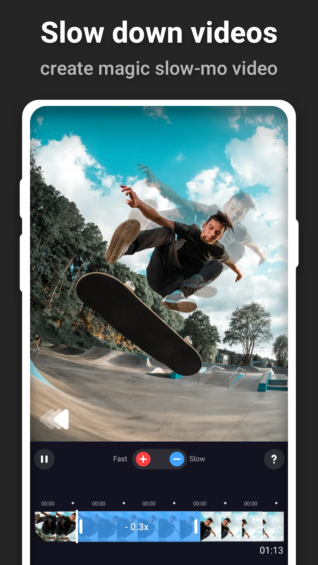 Slow motion video editor can easily create slow-mo and fast motion effect. You can slow down the playback speed of the video and also fast forward the video playback rate. Slow down videos To make slow mo effect, select the speed you want, support 0.1x, 0.2x, 0.25x, 0.3x, 0.4x, 0.5x, 0.6x, 0.8x, 0.9x, 0.95x Fast forward videos...