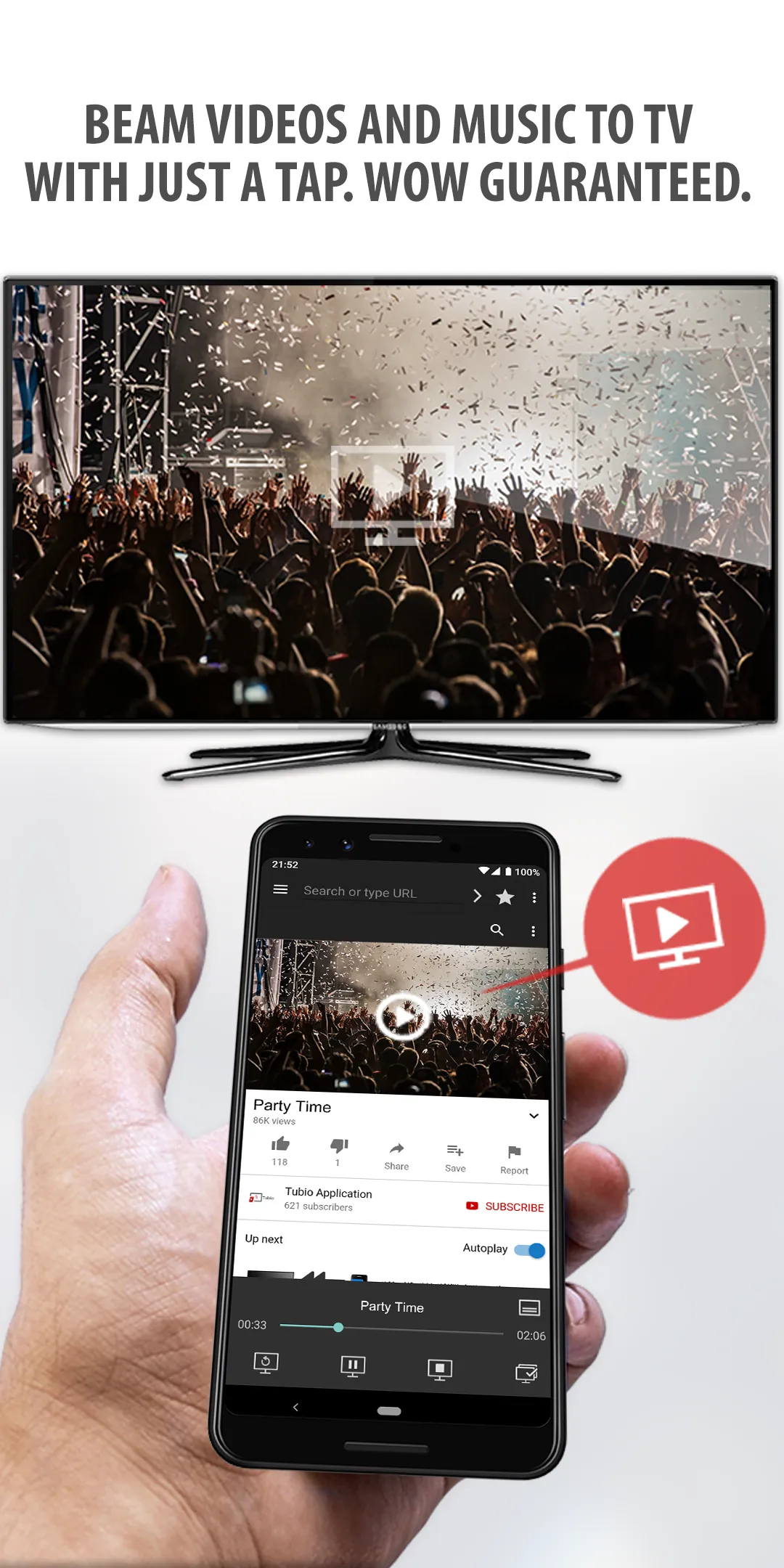 Cast web videos and music from your phone to your TV wirelessly and for FREE. Use this app to browse your favorite web media to discover online video or audio you'd like to enjoy - then simply tap play. Locally stored videos and photos playback is now supported. Tubio automatically discovers all connected TVs around (over the same Wi-Fi network) and lets you stream with just your phone. ...