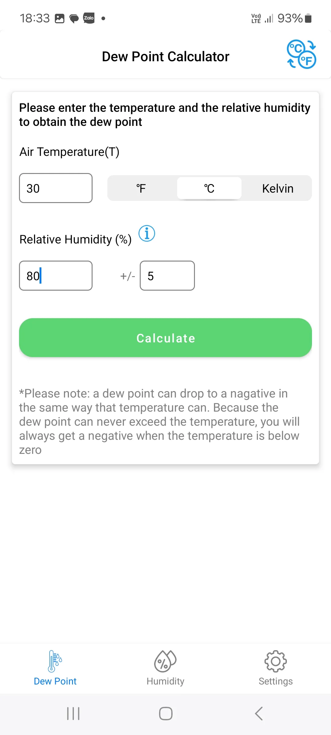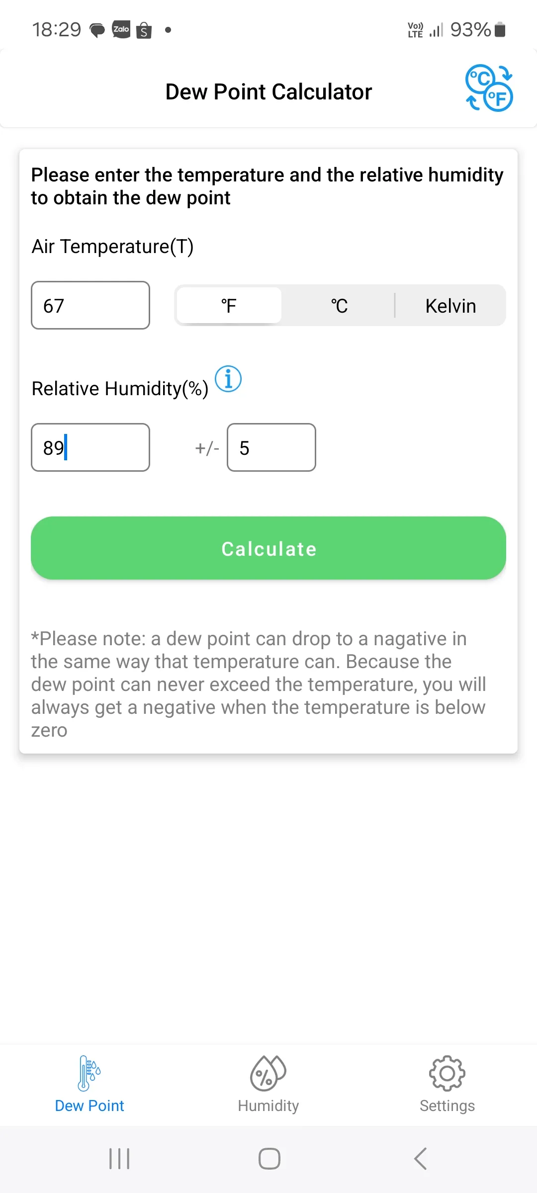 Dew Point Humidity Calculator App is the best app to find the temperature at which the water vapour of the atmospheric air must condense into liquid water and reaches its coolest point called the saturation. You can calculate the dew point temperature at which the air moisture converts into water using this calculator app. There are two calculators that you can use: 1. Calculate Dew Point from Air Temperature and Relative Humidity (%) 2. Calculate Relative Humidity (RH) or Dew Point from Dry Bulb temperature, plus either Wet Bulb or Dew Point (Psychrometric Calculator) ...